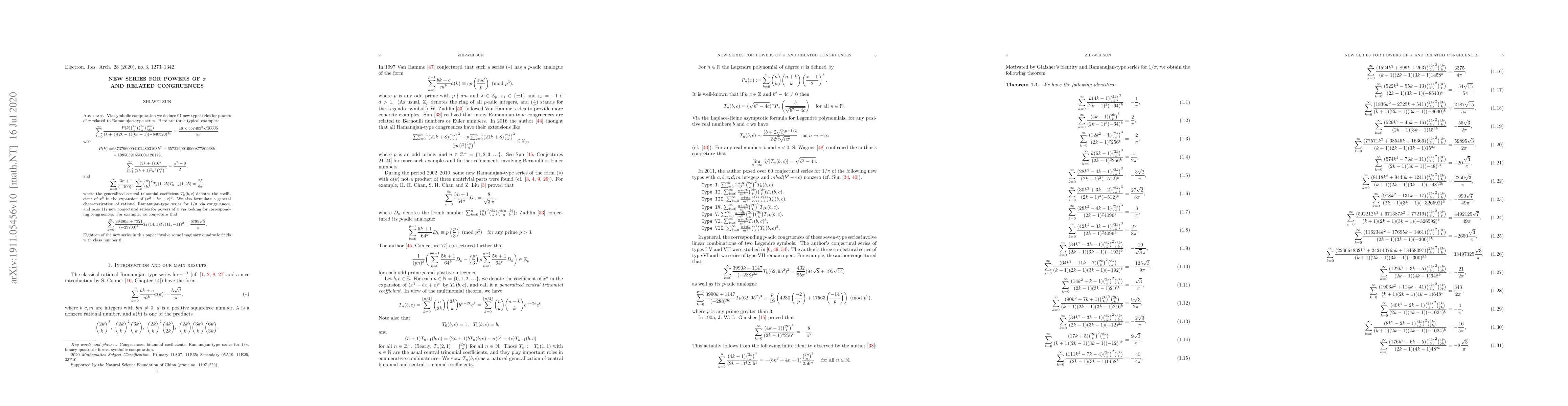 Via symbolic computation we deduce 97 new type series for powers of $\pi$ related to Ramanujan-type series. Here are three typical examples: $$\sum_{k=0}^\infty \frac{P(k) \binom{2k}k\binom{3k}k \binom{6k}{3k}}{(k+1)(2k-1)(6k-1)(-640320)^{3k}} =\frac{18\times557403^3\sqrt{10005}}{5\pi}$$ with \begin{align*}P(k) = &637379600041024803108 k^2 + 657229991696087780968 k \\&+ 19850391655004126179, \end{align*} $$\sum_{k=1}^\infty \frac{(3k+1)16^k}{(2k+1)^2k^3\binom{2k}k^3} = \frac{\pi^2-8}2,$$ and $$\sum_{n=0}^\infty\frac{3n+1}{(-100)^n} \sum_{k=0}^n{n\choose k}^2T_k(1,25)T_{n-k}(1,25) = \frac{25}{8\pi},$$ where the generalized central trinomial coefficient $T_k(b,c)$ denotes the coefficient of $x^k$ in the expansion of $(x^2+bx+c)^k$. We also formulate a general characterization of rational Ramanujan-type series for $1/\pi$ via congruences, and pose 117 new conjectural series for powers of $\pi$ via looking for corresponding congruences. For example, we conjecture that $$\sum_{k=0}^\infty\frac{39480k+7321}{(-29700)^k}T_k(14,1)T_k(11,-11)^2=\frac{6795\sqrt5}{\pi}.$$ Eighteen of the new series in this paper involve some imaginary quadratic fields with class number $8$.
