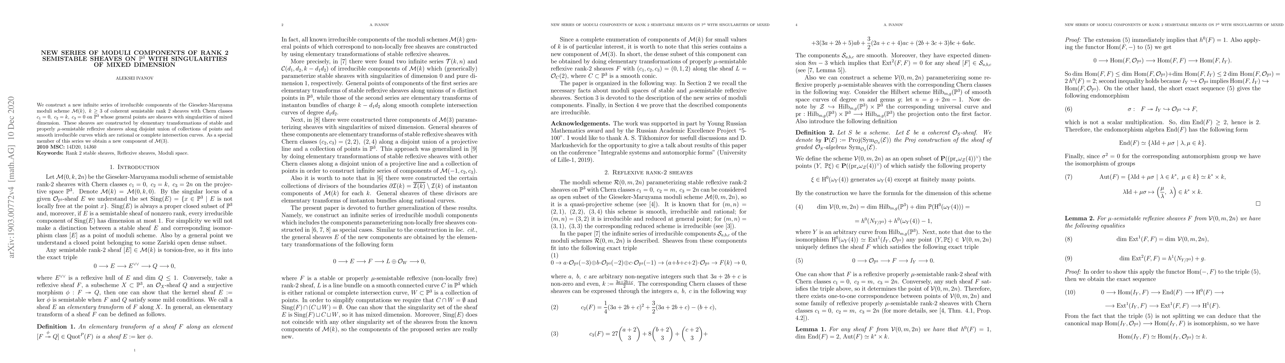 This research constructs an infinite series of irreducible components in the Gieseker-Maruyama moduli scheme of rank 2 semistable sheaves on $\mathbb{P}^3$ with specific Chern classes, featuring sheaves with mixed-dimension singularities formed via elementary transformations. A special case identifies a new component in $\mathcal{M}(3)$.