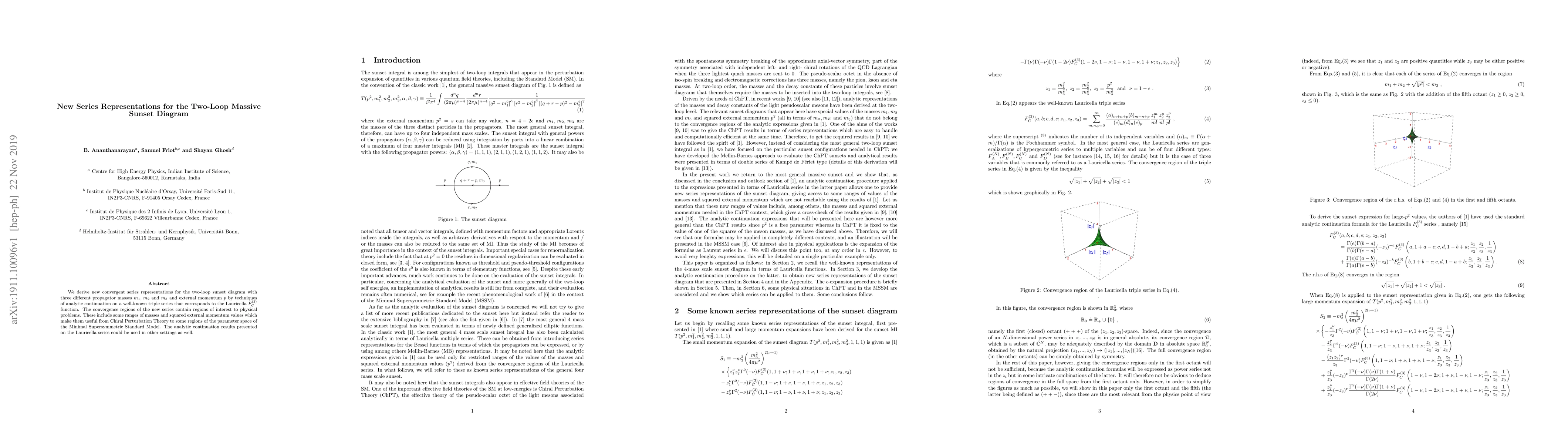 We derive new convergent series representations for the two-loop sunset diagram with three different propagator masses m1, m2 and m3 and external momentum p by techniques of analytic continuation on a well-known triple series that corresponds to the Lauricella Fc function. The convergence regions of the new series contain regions of interest to physical problems. These include some ranges of masses and squared external momentum values which make them useful from Chiral Perturbation Theory to some regions of the parameter space of the Minimal Supersymmetric Standard Model. The analytic continuation results presented on the Lauricella series could be used in other settings as well.