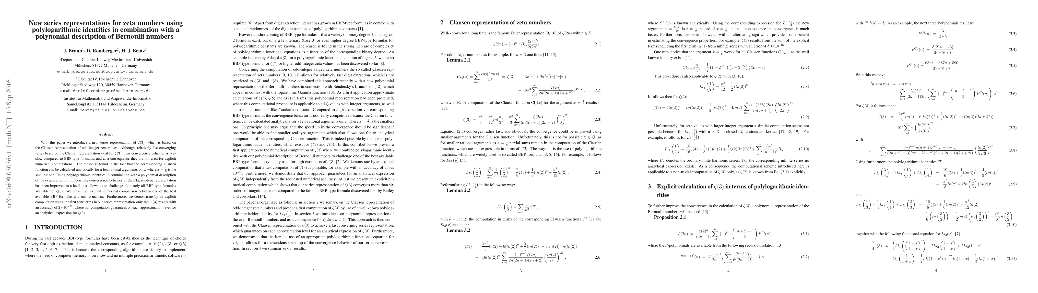 With this paper we introduce a new series representation of $\zeta(3)$, which is based on the Clausen representation of odd integer zeta values. Although, relatively fast converging series based on the Clausen representation exist for $\zeta(3)$, their convergence behavior is very slow compared to BBP-type formulas, and as a consequence they are not used for explicit numerical computations. The reason is found in the fact that the corresponding Clausen function can be calculated analytically for a few rational arguments only, where $x=\frac{1}{6}$ is the smallest one. Using polylogarithmic identities in combination with a polynomial description of the even Bernoulli numbers, the convergence behavior of the Clausen-type representation has been improved to a level that allows us to challenge ultimately all BBP-type formulas available for $\zeta(3)$. We present an explicit numerical comparison between one of the best available BBP formulas and our formalism. Furthermore, we demonstrate by an explicit computation using the first four terms in our series representation only that $\zeta(3)$ results with an accuracy of $2*10^{-26}$, where our computation guarantees on each approximation level for an analytical expression for $\zeta(3)$.