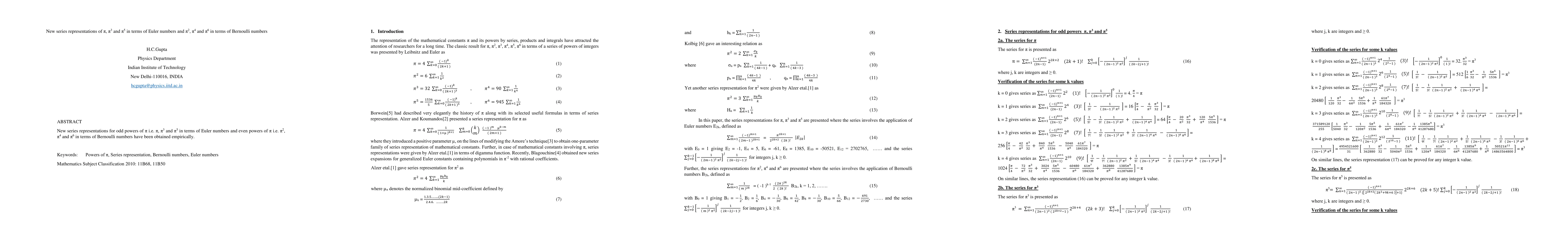 This paper presents new empirical series representations for odd powers of π (π, π³, π⁵) using Euler numbers and for even powers of π (π², π⁴, π⁶) using Bernoulli numbers. These findings provide alternative mathematical expressions linking these fundamental constants with special number sequences.