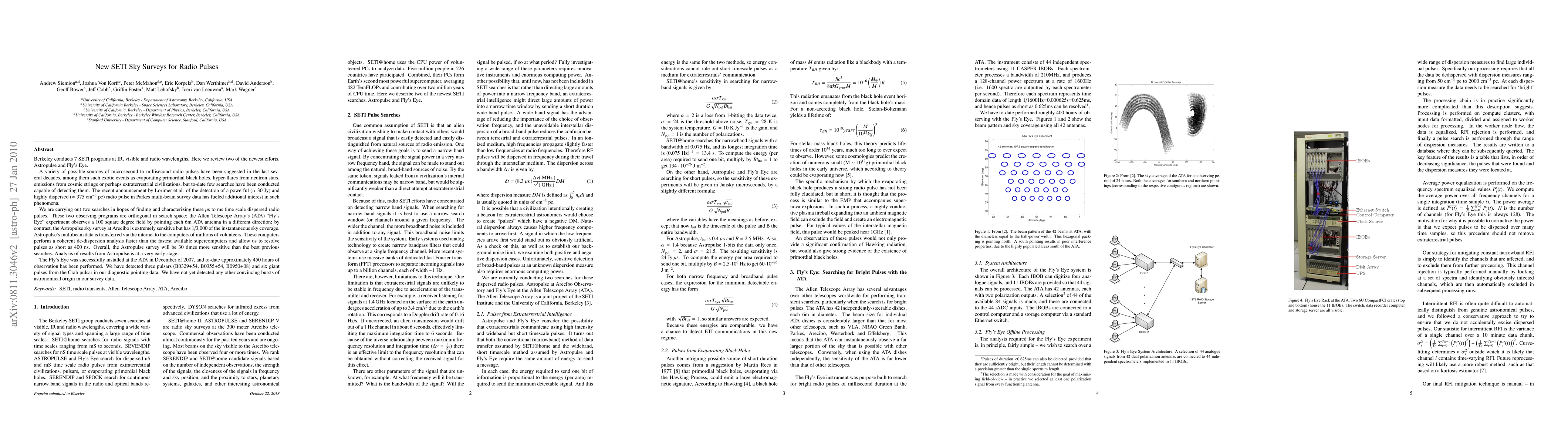 This paper reviews two new SETI radio pulse surveys conducted by Berkeley: Astropulse at Arecibo and Fly's Eye using the Allen Telescope Array. Astropulse leverages distributed computing to analyze multibeam data, achieving 30 times the sensitivity of previous searches. Fly's Eye covers a large sky area but with lower sensitivity, detecting pulsars and giant pulses but no other convincing bursts.