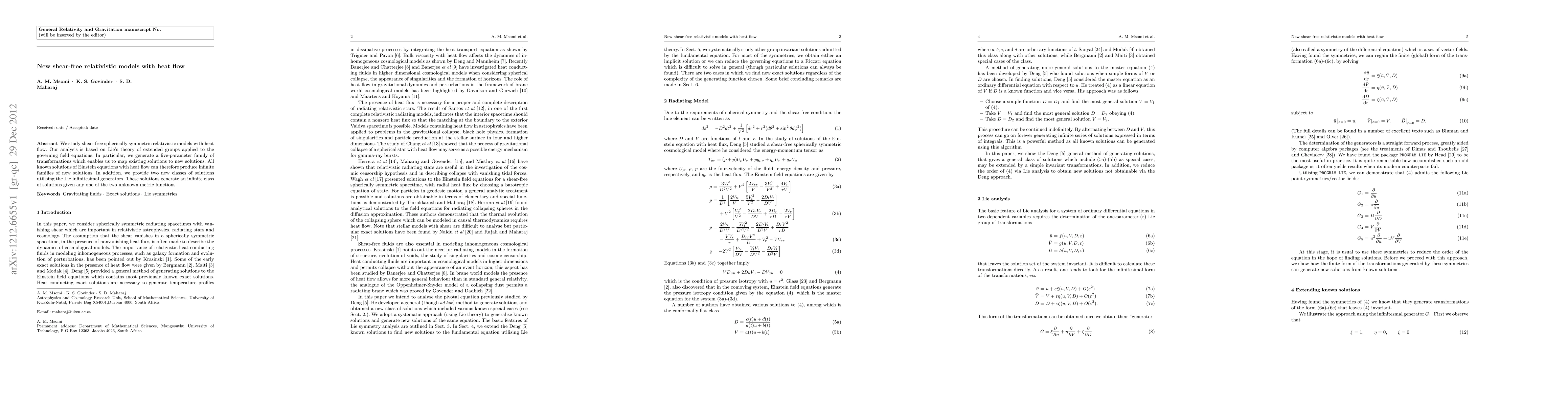 This research applies Lie's theory to generate a five-parameter family of transformations for shear-free, spherically symmetric relativistic models with heat flow, enabling the creation of infinite families of new solutions from known ones. It also introduces two new solution classes using Lie infinitesimal generators, allowing for an infinite range of solutions given one metric function.