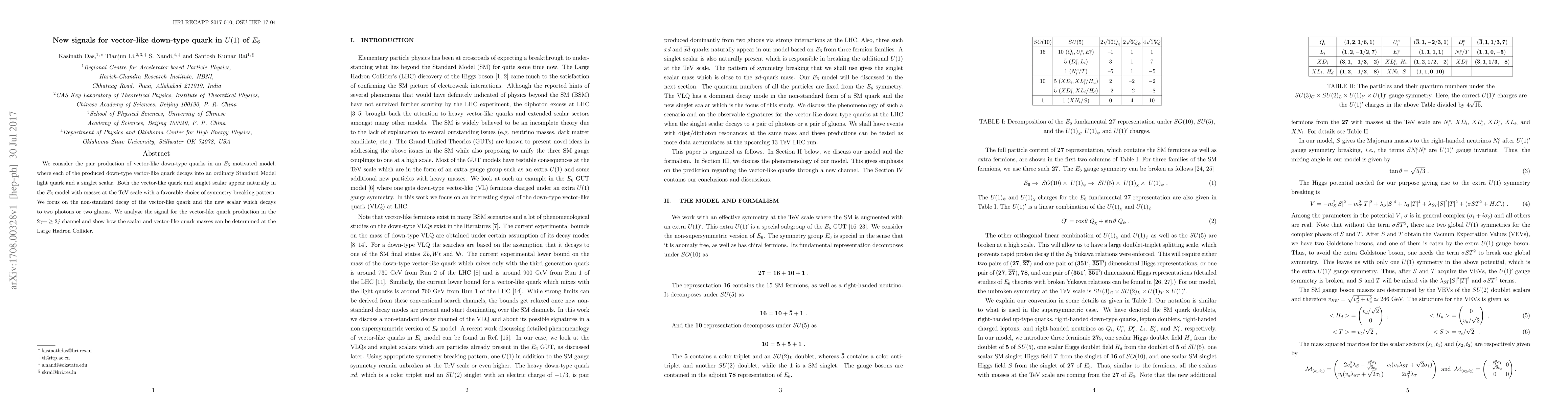 We consider the pair production of vector-like down-type quarks in an $E_6$ motivated model, where each of the produced down-type vector-like quark decays into an ordinary Standard Model light quark and a singlet scalar. Both the vector-like quark and singlet scalar appear naturally in the $E_6$ model with masses at the TeV scale with a favorable choice of symmetry breaking pattern. We focus on the non-standard decay of the vector-like quark and the new scalar which decays to two photons or two gluons. We analyze the signal for the vector-like quark production in the $2\gamma+\geq2j$ channel and show how the scalar and vector-like quark masses can be determined at the Large Hadron Collider.