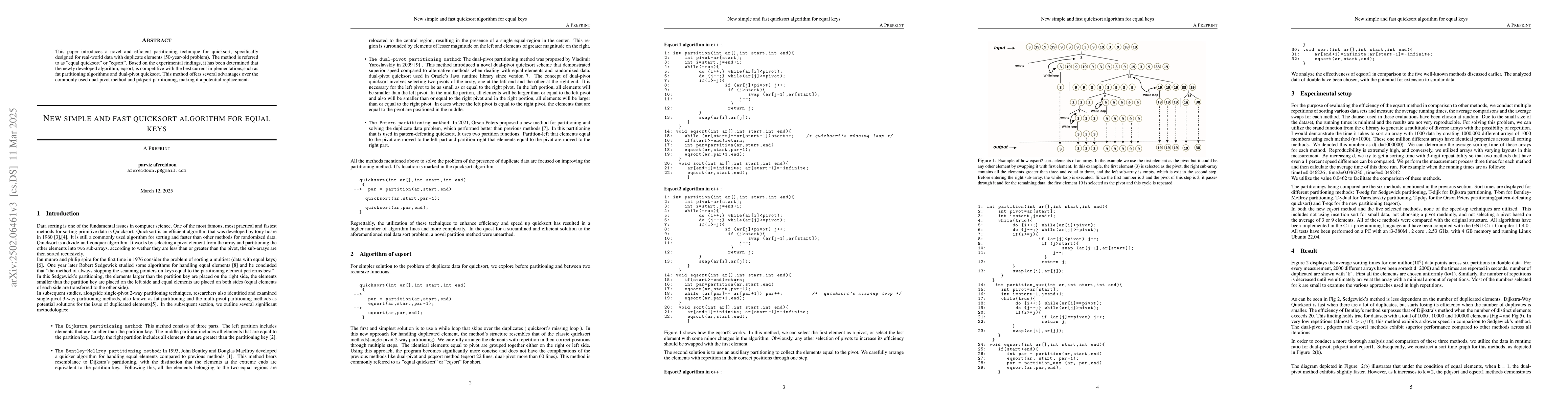 The paper presents a new quicksort algorithm, eqsort, designed for efficient sorting of real-world data with duplicate elements, which demonstrates competitive performance against existing methods such as dual-pivot quicksort and fat partitioning algorithms.