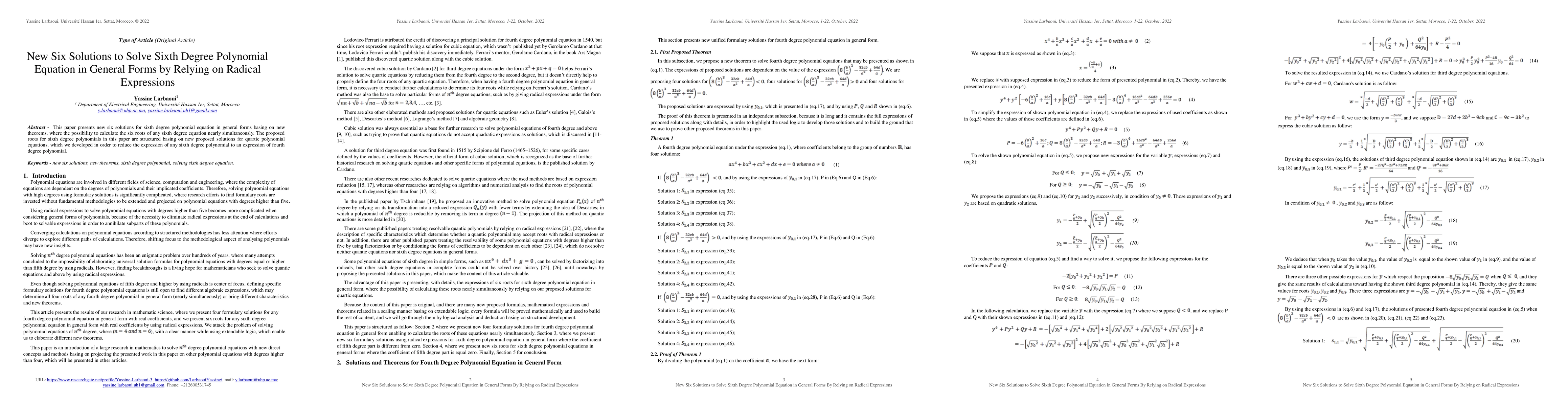 This paper presents new six solutions for sixth degree polynomial equation in general forms basing on new theorems, where the possibility to calculate the six roots of any sixth degree equation nearly simultaneously. The proposed roots for sixth degree polynomials in this paper are structured basing on new proposed solutions for quartic polynomial equations, which we developed in order to reduce the expression of any sixth degree polynomial to an expression of fourth degree polynomial.