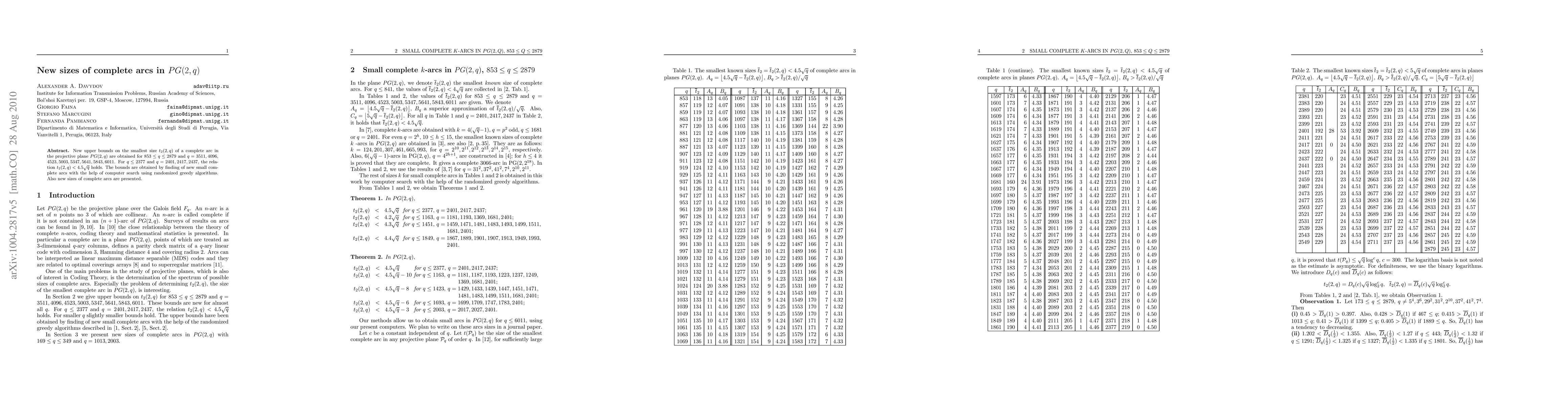 New upper bounds on the smallest size t_{2}(2,q) of a complete arc in the projective plane PG(2,q) are obtained for 853<= q<= 2879 and q=3511,4096, 4523,5003,5347,5641,5843,6011. For q<= 2377 and q=2401,2417,2437, the relation t_{2}(2,q)<4.5\sqrt{q} holds. The bounds are obtained by finding of new small complete arcs with the help of computer search using randomized greedy algorithms. Also new sizes of complete arcs are presented.
