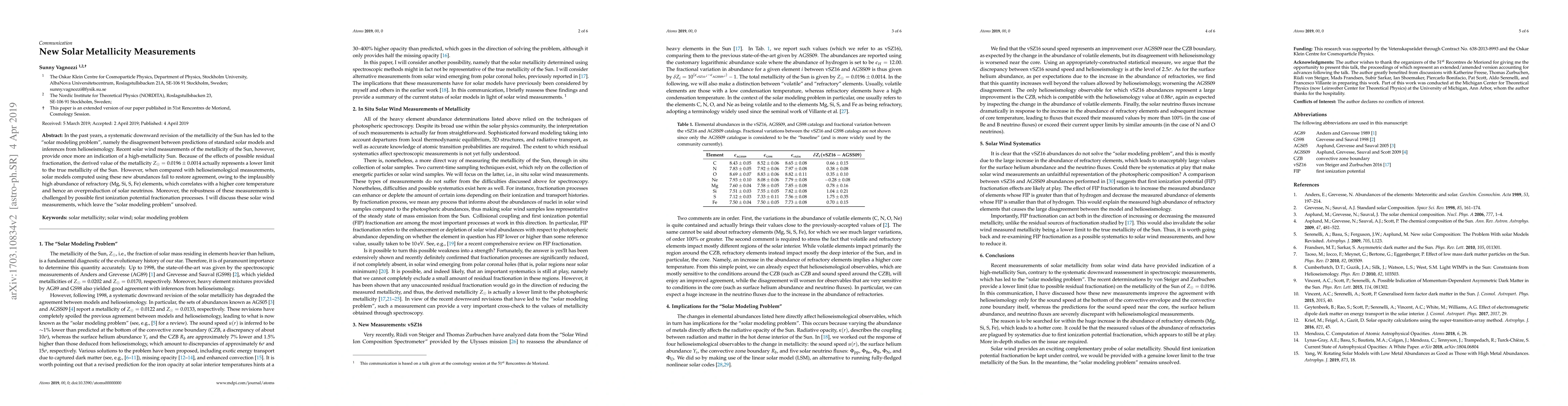 This paper reports new solar wind measurements indicating a higher solar metallicity ($Z_{\odot} = 0.0196 \pm 0.0014$), but these values still do not resolve the "solar modeling problem" due to discrepancies between solar model predictions and helioseismology.