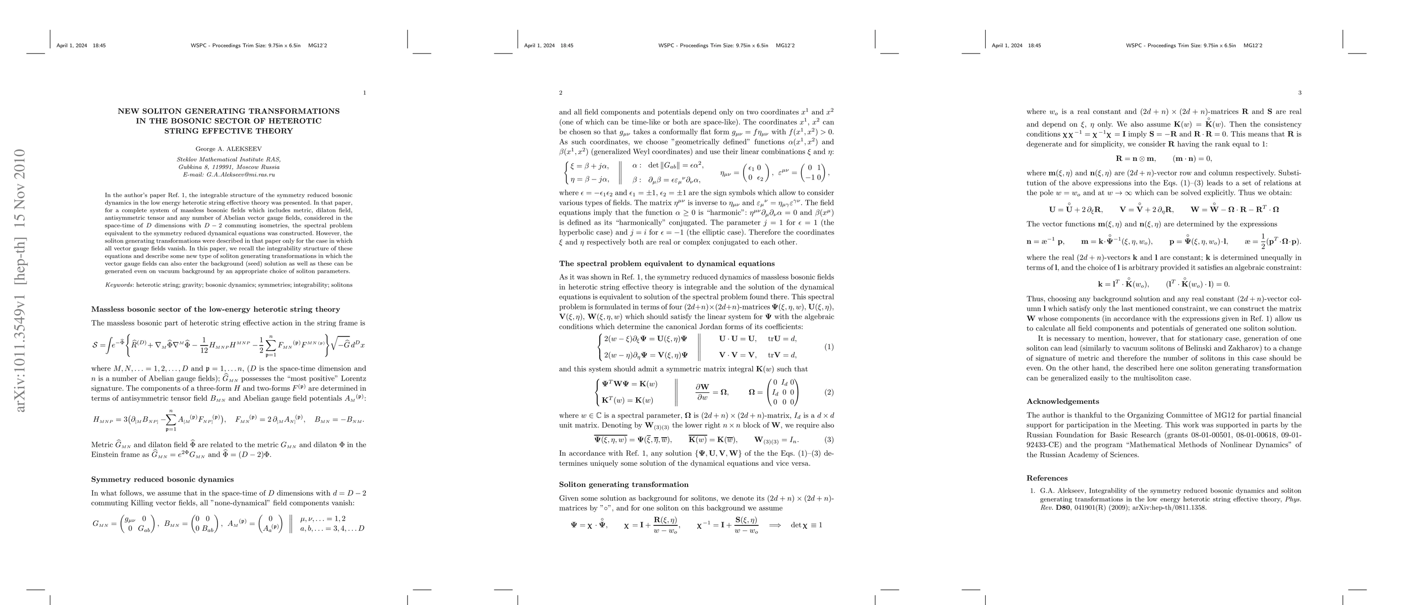 In the author's paper (Phys.Rev. D80, 041901(R) (2009)), the integrable structure of the symmetry reduced bosonic dynamics in the low energy heterotic string effective theory was presented. In that paper, for a complete system of massless bosonic fields which includes metric, dilaton field, antisymmetric tensor and any number of Abelian vector gauge fields, considered in the space-time of $D$ dimensions with $D-2$ commuting isometries, the spectral problem equivalent to the symmetry reduced dynamical equations was constructed. However, the soliton generating transformations were described in that paper only for the case in which all vector gauge fields vanish. In this paper, we recall the integrability structure of these equations and describe some new type of soliton generating transformations in which the vector gauge fields can also enter the background (seed) solution as well as these can be generated even on vacuum background by an appropriate choice of soliton parameters.