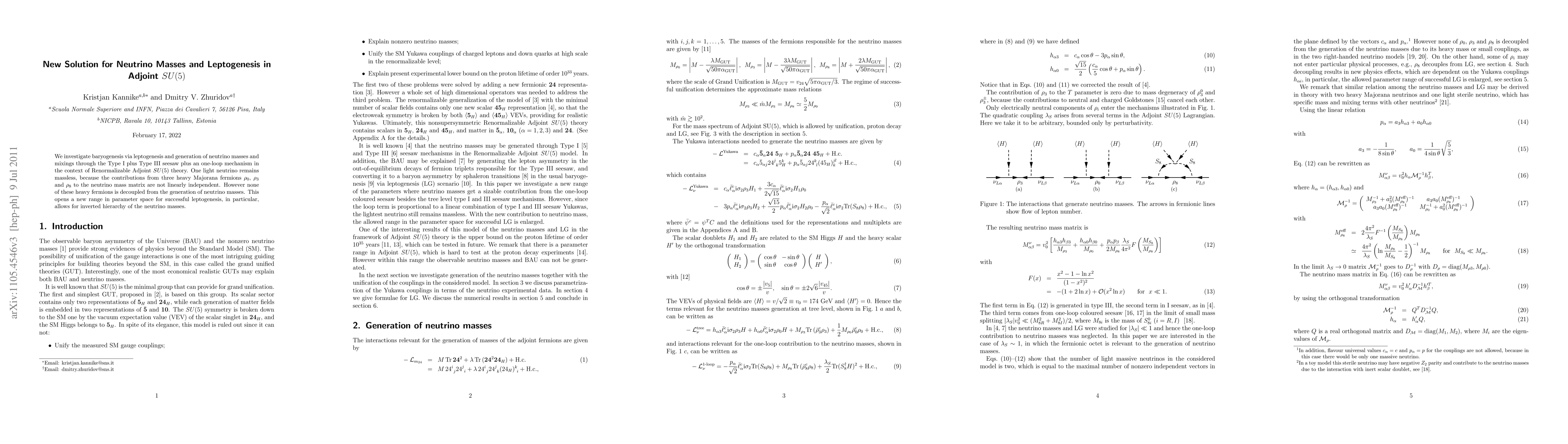 This paper explores a novel approach to generating neutrino masses and achieving baryogenesis through leptogenesis in the framework of Renormalizable Adjoint SU(5) theory. It combines Type I and Type III seesaw mechanisms with an additional one-loop mechanism, allowing for an inverted hierarchy of neutrino masses and new parameter space for successful leptogenesis.