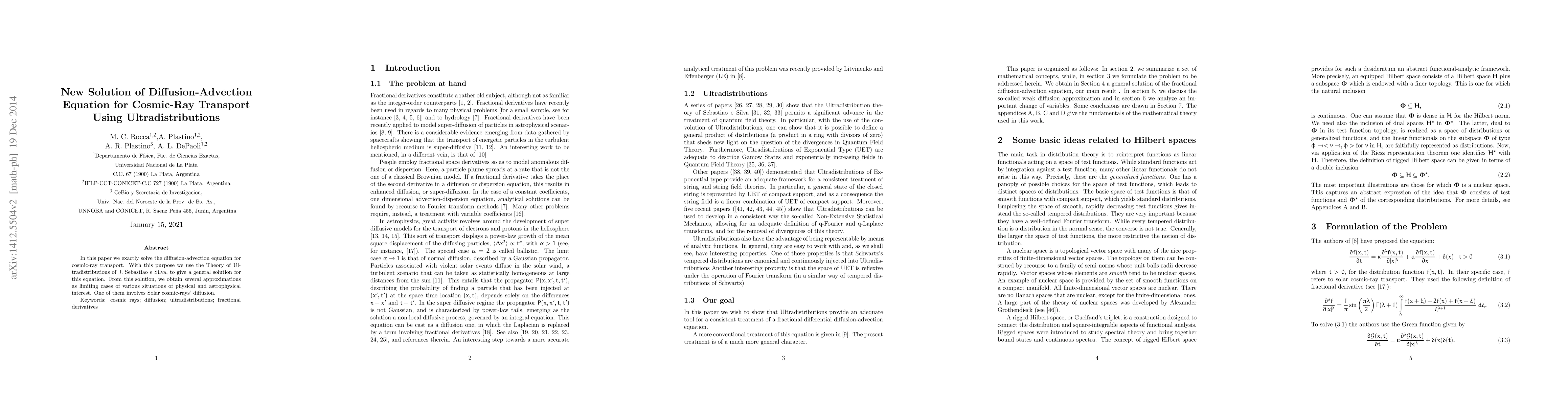 This paper presents an exact solution to the diffusion-advection equation for cosmic-ray transport using the Theory of Ultradistributions, providing general solutions and approximations relevant to astrophysical phenomena, including Solar cosmic-rays' diffusion.