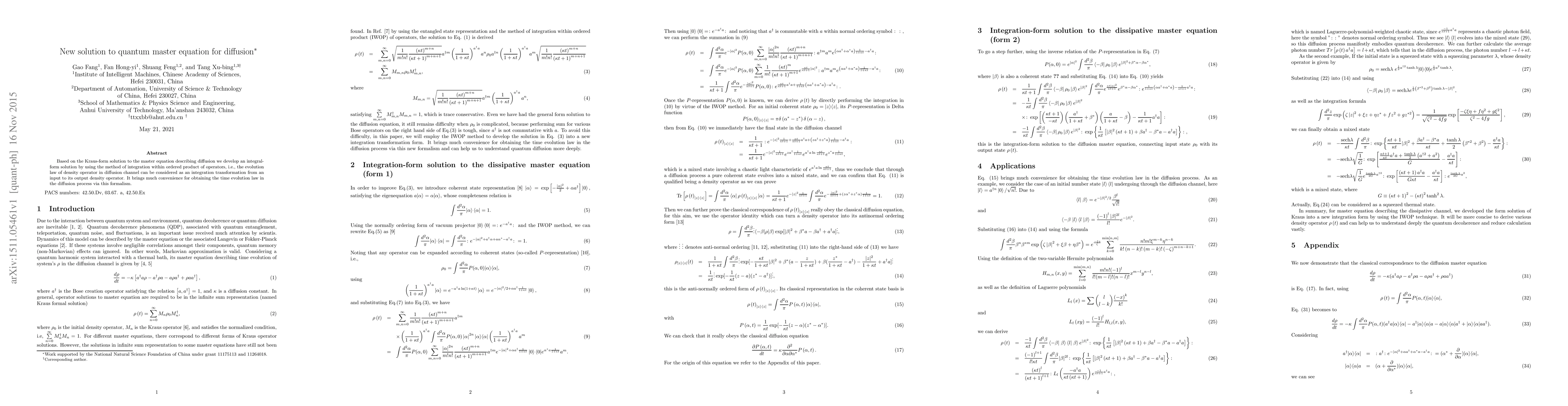 This paper presents a new integral form solution to the quantum master equation for diffusion using the method of integration within ordered product of operators. This approach simplifies the time evolution law of the density operator in diffusion channels.