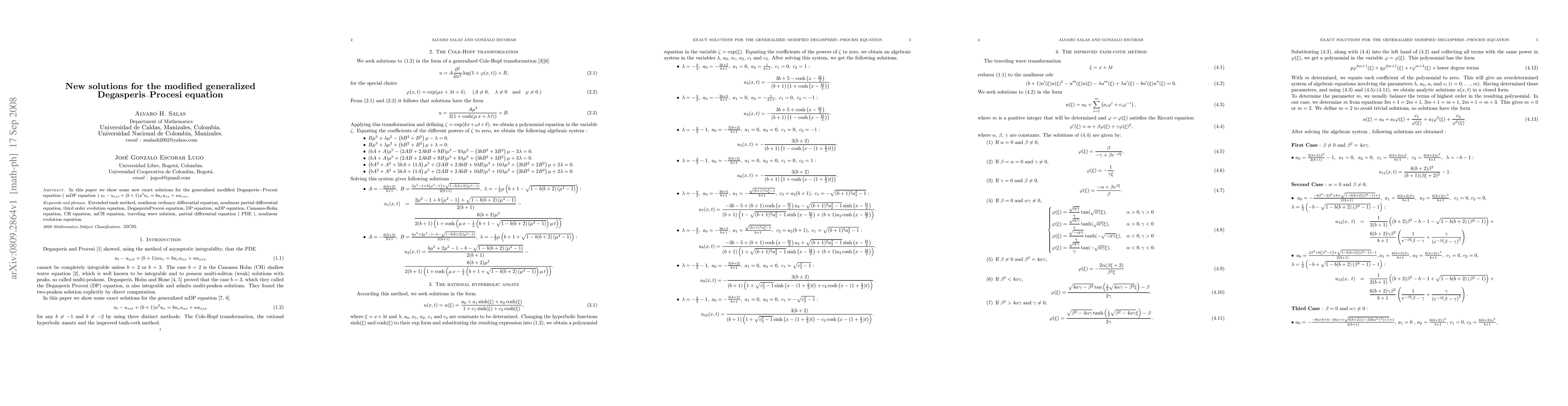 Summary: This paper presents novel exact solutions for the generalized modified Degasperis-Procesi (mDP) equation, contributing to the understanding of its dynamics and potential applications. The findings enhance the mathematical toolkit for solving complex nonlinear wave equations.