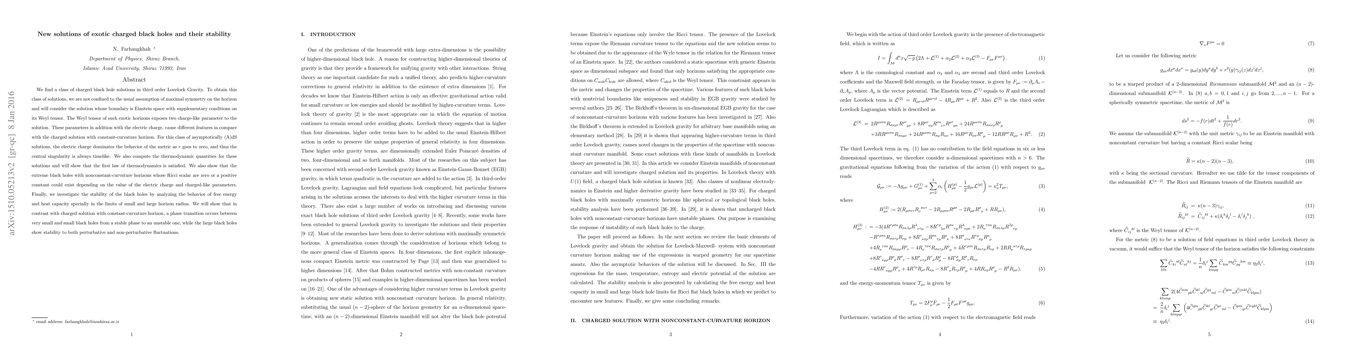 This paper discovers a class of exotic charged black holes in third-order Lovelock gravity with unstable behavior for very small black holes, contrasting with stable large ones.