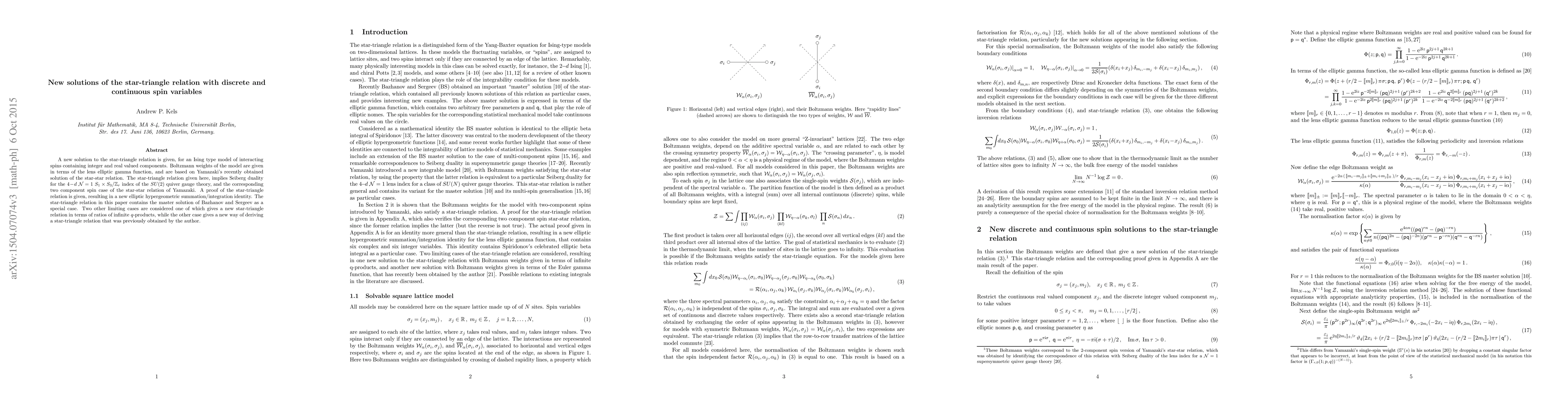 A new solution to the star-triangle relation is given, for an Ising type model that involves interacting spins, that contain integer and real valued components. Boltzmann weights of the model are given in terms of the lens elliptic-gamma function, and are based on Yamazaki's recently obtained solution of the star-star relation. The star-triangle given here, implies Seiberg duality for the $4\!-\!d$ $\mathcal{N}=1$ $S_1\times S_3/\mathbb{Z}_r$ index of the $SU(2)$ quiver gauge theory, and the corresponding two component spin case of the star-star relation of Yamazaki. A proof of the star-triangle relation is given, resulting in a new elliptic hypergeometric integral identity. The star-triangle relation in this paper contains the master solution of Bazhanov and Sergeev as a special case. Two other limiting cases are considered one of which gives a new star-triangle relation in terms of ratios of infinite $q$-products, while the other case gives a new way of deriving a star-triangle relation previously obtained by the author.