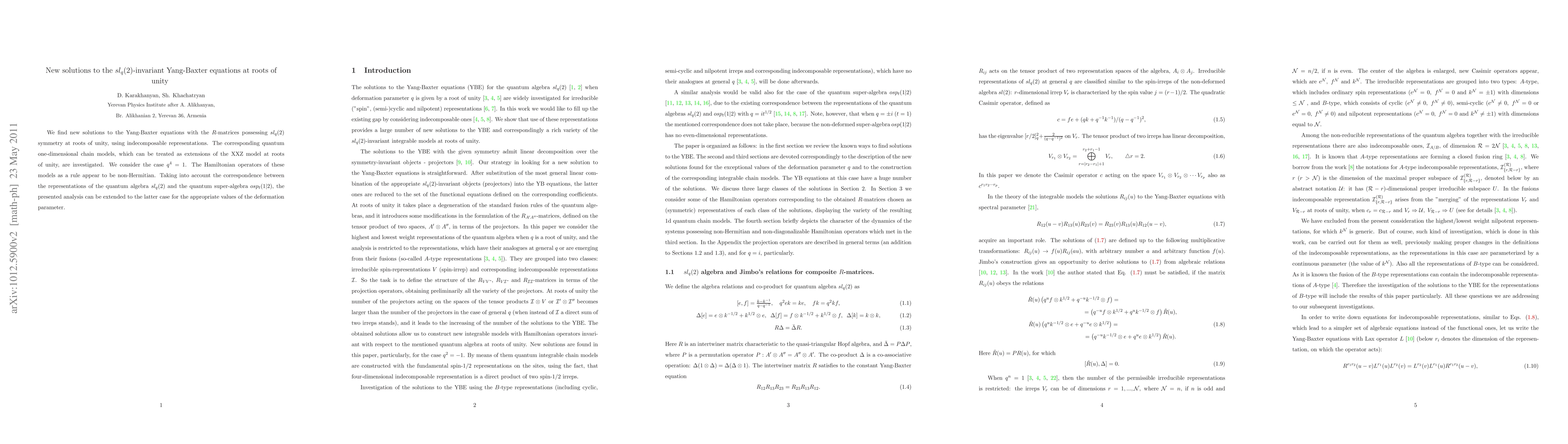 This paper presents new solutions to the $sl_q(2)$-invariant Yang-Baxter equations at roots of unity using indecomposable representations, and explores the corresponding quantum one-dimensional chain models, which extend the XXZ model. The Hamiltonian operators typically found are non-Hermitian, and the analysis is extendable to the $osp_t(1|2)$ quantum super-algebra for specific deformation parameters.