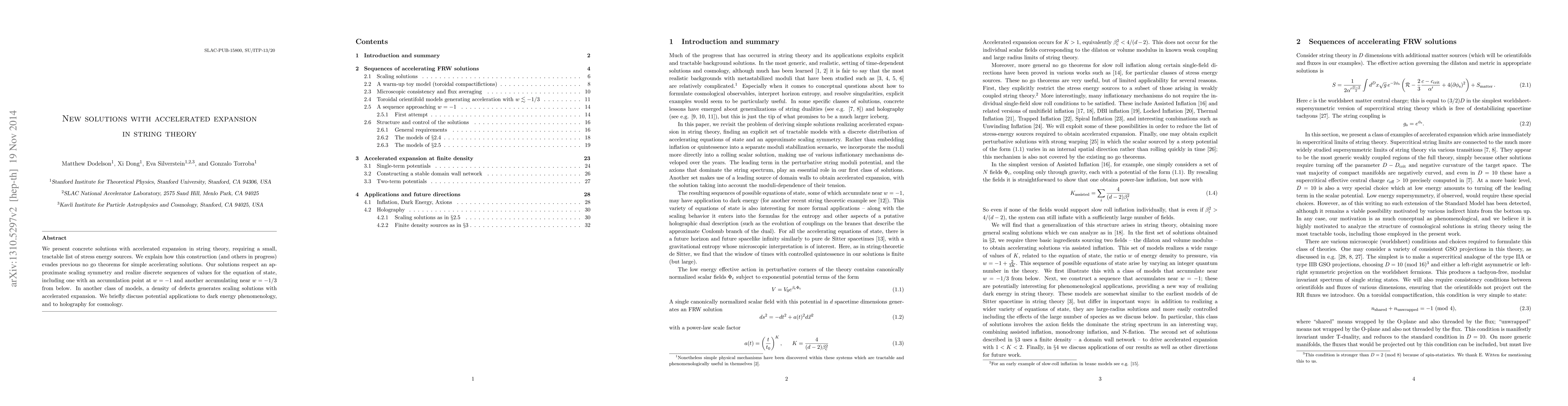 The paper presents new string theory solutions that achieve accelerated expansion with minimal stress-energy sources, bypassing previous no-go theorems. These solutions respect scaling symmetry and feature discrete sequences for the equation of state, including values accumulating at w=-1 and w=-1/3. Potential applications to dark energy and cosmological holography are also discussed.