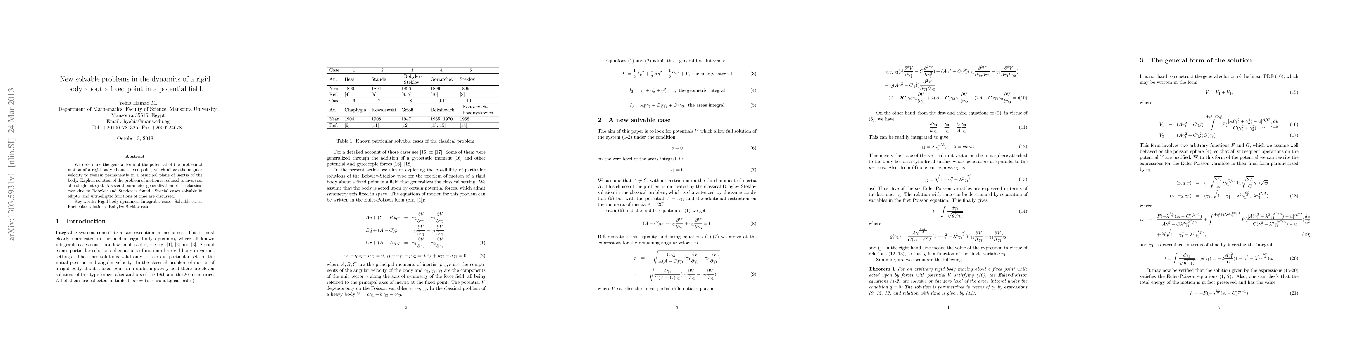 We determine the general form of the potential of the problem of motion of a rigid body about a fixed point, which allows the angular velocity to remain permanently in a principal plane of inertia of the body. Explicit solution of the problem of motion is reduced to inversion of a single integral. A several-parameter generalization of the classical case due to Bobylev and Steklov is found. Special cases solvable in elliptic and ultraelliptic functions of time are discussed.