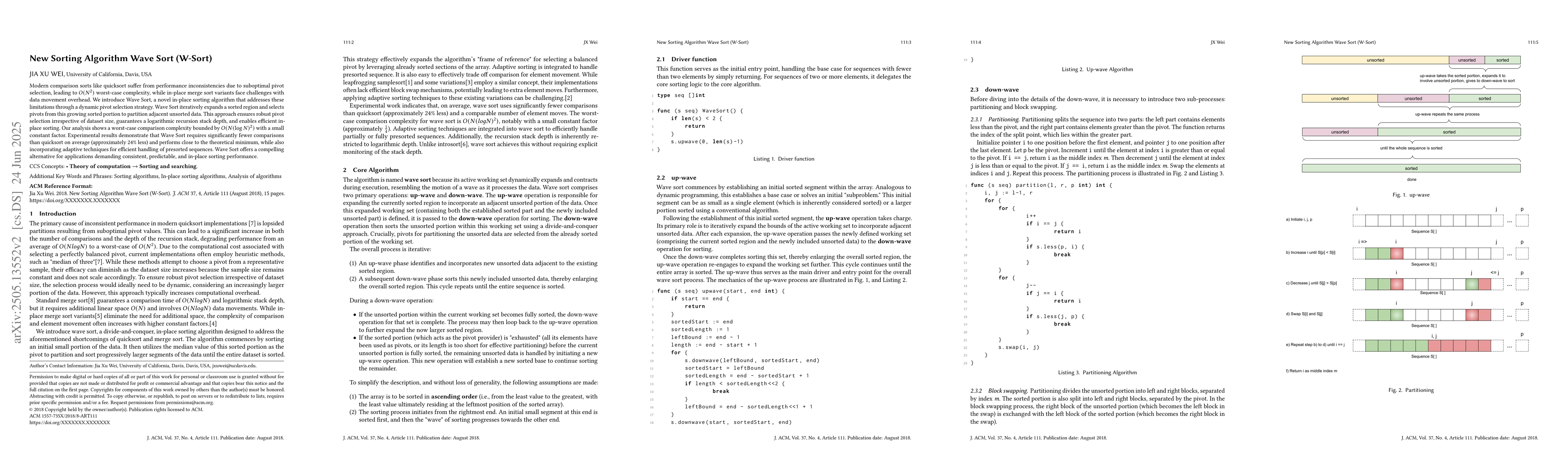 The research introduces Wave Sort (W-Sort), a novel in-place sorting algorithm addressing inconsistencies in modern comparison sorts like quicksort. W-Sort ensures robust pivot selection, logarithmic recursion depth, and efficient in-place sorting, with a worst-case complexity of O(N(log N)^2), outperforming quicksort with approximately 24% fewer comparisons on average.