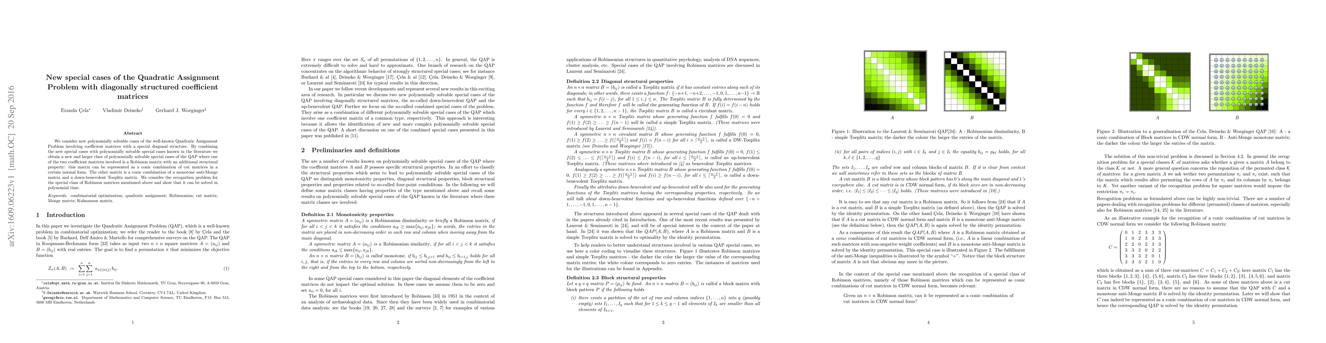 We consider new polynomially solvable cases of the well-known Quadratic Assignment Problem involving coefficient matrices with a special diagonal structure. By combining the new special cases with polynomially solvable special cases known in the literature we obtain a new and larger class of polynomially solvable special cases of the QAP where one of the two coefficient matrices involved is a Robinson matrix with an additional structural property: this matrix can be represented as a conic combination of cut matrices in a certain normal form. The other matrix is a conic combination of a monotone anti-Monge matrix and a down-benevolent Toeplitz matrix. We consider the recognition problem for the special class of Robinson matrices mentioned above and show that it can be solved in polynomial time.