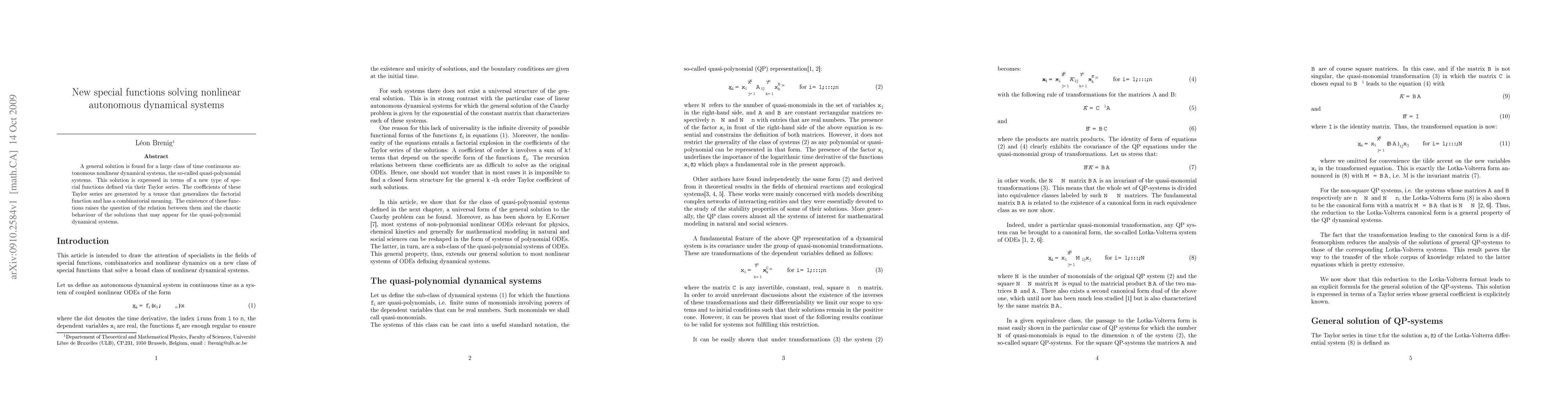 This paper introduces new special functions to solve quasi-polynomial autonomous nonlinear dynamical systems, expressed via Taylor series with coefficients generated by a combinatorial tensor. The study also explores potential connections between these functions and chaotic behaviors in the systems.