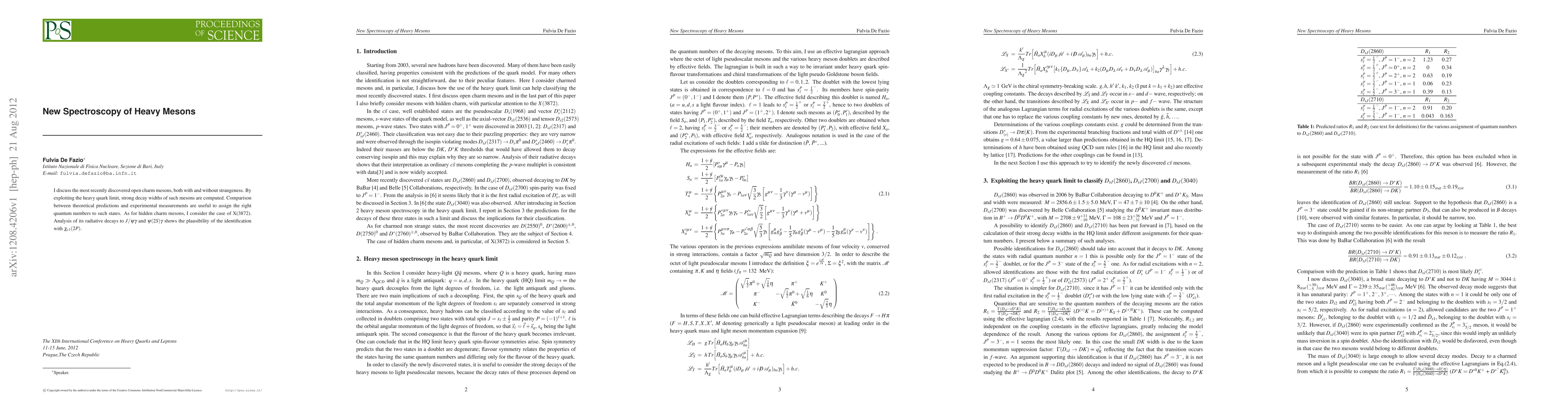I discuss the most recently discovered open charm mesons, both with and without strangeness. By exploiting the heavy quark limit, strong decay widths of such mesons are computed. Comparison between theoretical predictions and experimental measurements are useful to assign the right quantum numbers to such states. As for hidden charm mesons, I consider the case of X(3872). Analysis of its radiative decays to $J/\psi \gamma$ and $\psi(2S) \gamma$ shows the plausibility of the identification with $\chi_{c1}(2P)$.