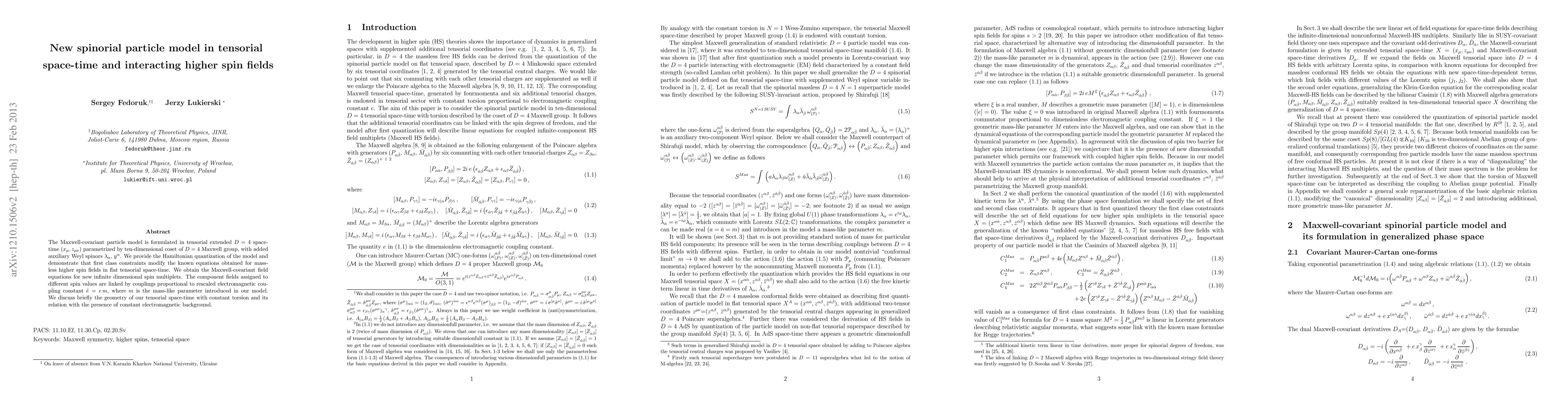 This paper formulates a Maxwell-covariant particle model in extended D=4 tensorial space-time, introducing Weyl spinors and deriving Hamiltonian quantization. The model modifies equations for massless higher spin fields, leading to Maxwell-covariant field equations for new infinite dimensional spin multiplets linked by electromagnetic couplings.