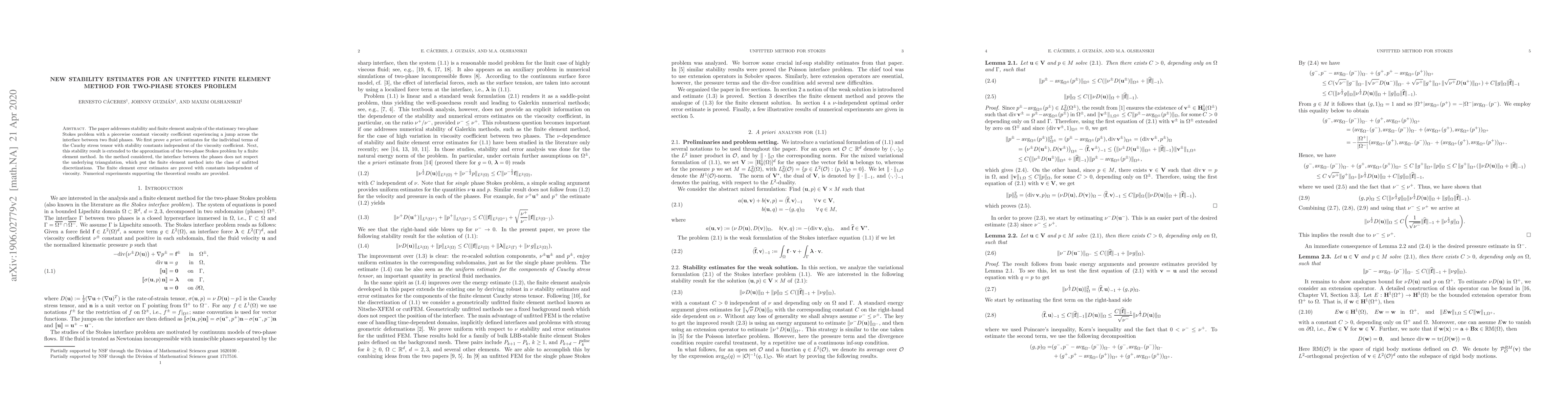 This paper proves stability estimates for an unfitted finite element method addressing the two-phase Stokes problem with a discontinuous viscosity coefficient. It establishes a priori estimates for the Cauchy stress tensor and extends these to finite element approximations, ensuring error estimates are independent of the viscosity coefficient, supported by numerical experiments.