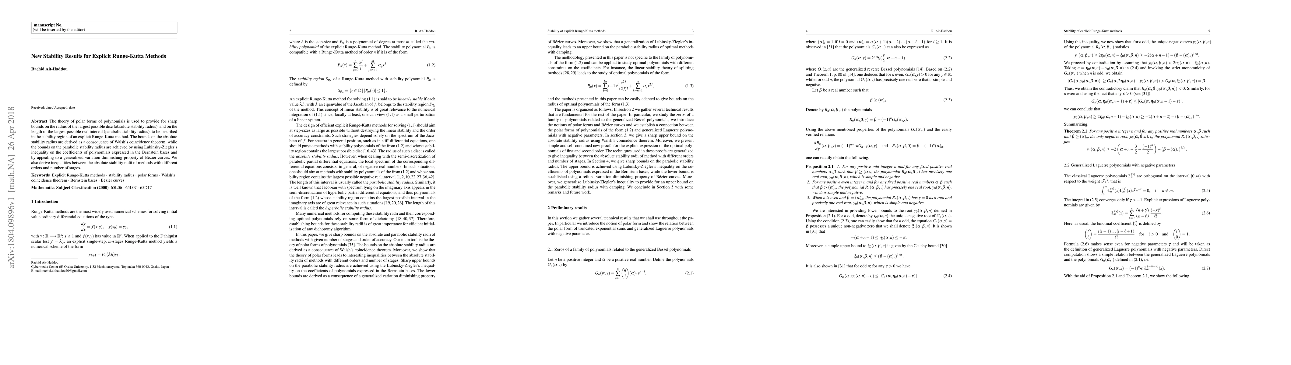 The theory of polar forms of polynomials is used to provide for sharp bounds on the radius of the largest possible disc (absolute stability radius), and on the length of the largest possible real interval (parabolic stability radius), to be inscribed in the stability region of an explicit Runge-Kutta method. The bounds on the absolute stability radius are derived as a consequence of Walsh's coincidence theorem, while the bounds on the parabolic stability radius are achieved by using Lubinsky-Ziegler's inequality on the coefficients of polynomials expressed in the Bernstein bases and by appealing to a generalized variation diminishing property of Bezier curves. We also derive inequalities between the absolute stability radii of methods with different orders and number of stages.