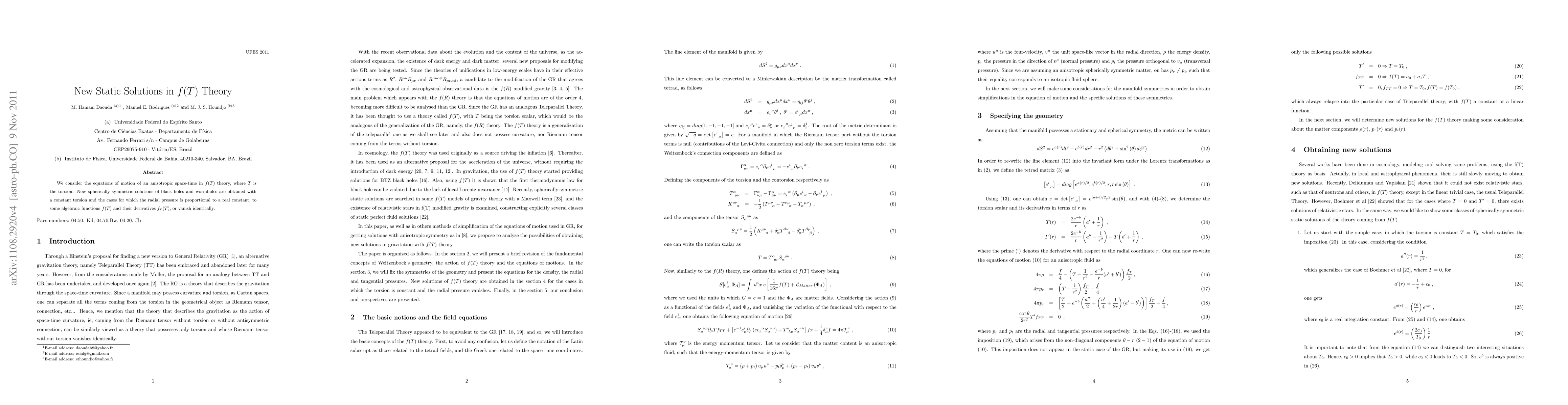 Researchers found new static solutions for black holes and wormholes in f(T) theory, focusing on cases with constant torsion and specific functions of torsion T.