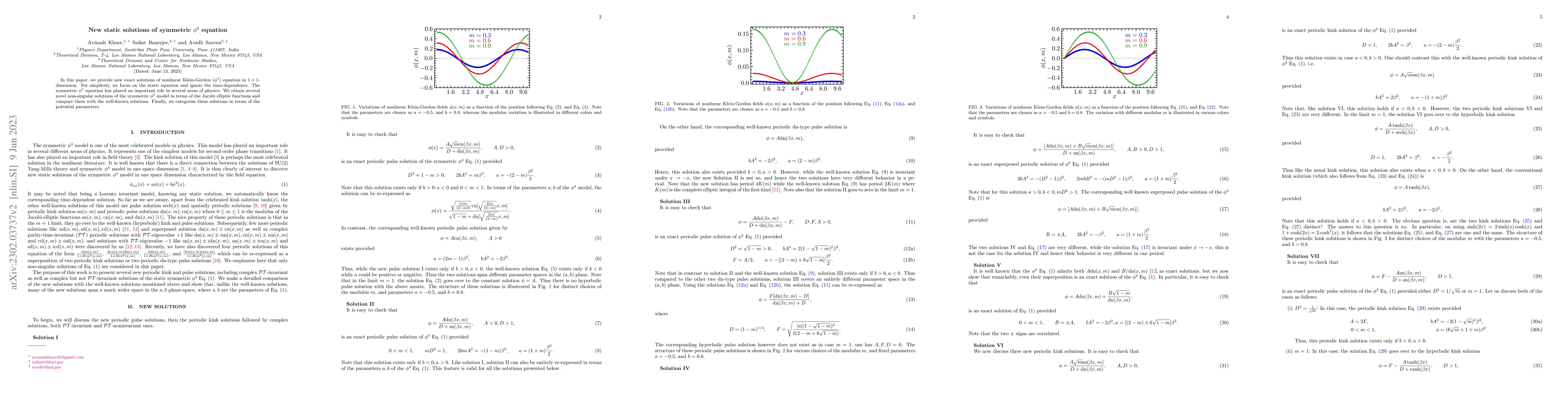 In this paper, we provide new exact solutions of nonlinear Klein-Gordon ($\phi^4$) equation in $1+1$-dimension. For simplicity, we focus on the static equation and ignore the time-dependence. The symmetric $\phi^4$ equation has played an important role in several areas of physics. We obtain several novel non-singular solutions of the symmetric $\phi^4$ model in terms of the Jacobi elliptic functions and compare them with the well-known solutions. Finally, we categorize these solutions in terms of the potential parameters.