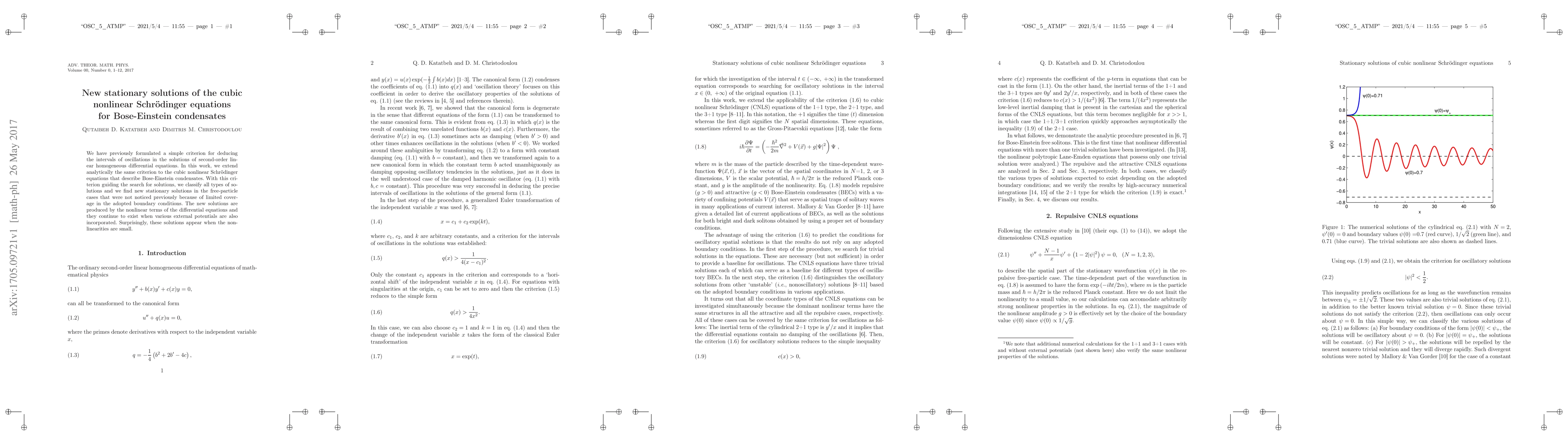 This paper extends a previously developed criterion for linear differential equations to cubic nonlinear Schrödinger equations, revealing new stationary solutions for Bose-Einstein condensates that were previously unnoticed due to limited boundary conditions. These new solutions persist even with external potentials and emerge when nonlinearities are small.