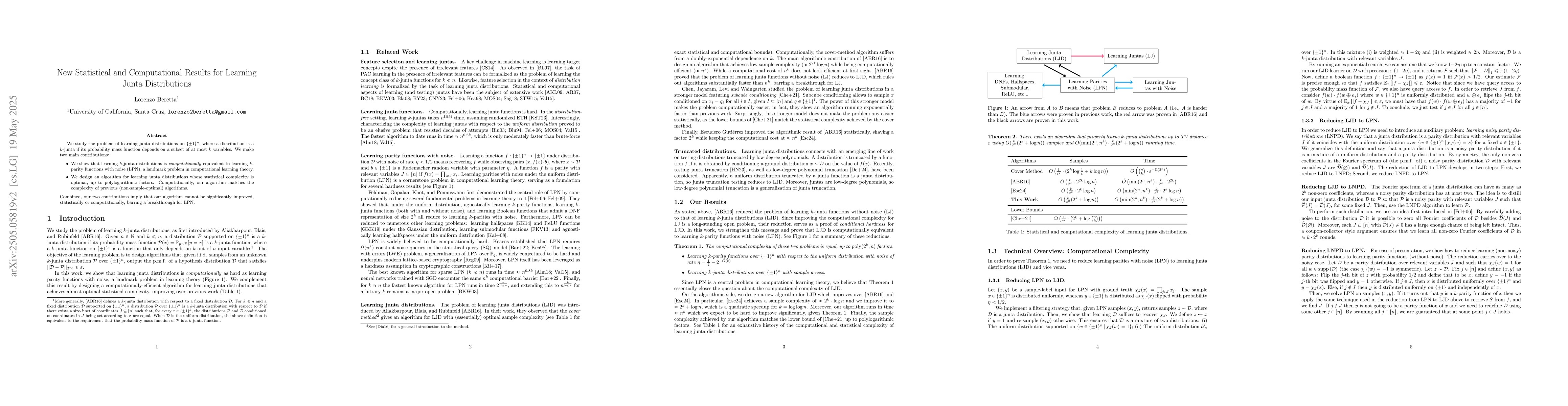 The paper establishes computational equivalence between learning k-junta distributions and the well-known problem of learning LPN (Learning Parity with Noise). It also presents an algorithm for learning junta distributions with optimal statistical complexity.