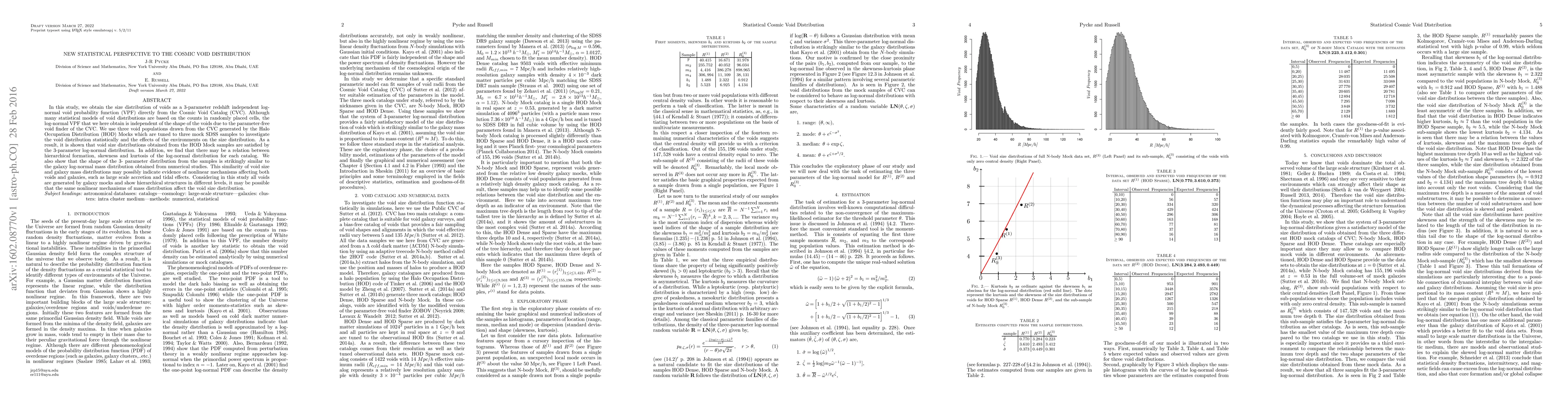 This research presents a redshift-independent, 3-parameter log-normal void probability function (VPF) for cosmic void size distribution, derived directly from the Cosmic Void Catalog (CVC). The study uses Halo Occupation Distribution (HOD) Mocks to investigate void distribution statistically and find that these distributions conform to the log-normal model. A potential link between hierarchical formation and the skewness/kurtosis of this distribution is noted. Interestingly, the void size distribution resembles the galaxy log-normal mass distribution, suggesting common nonlinear mechanisms may influence both voids and galaxies.