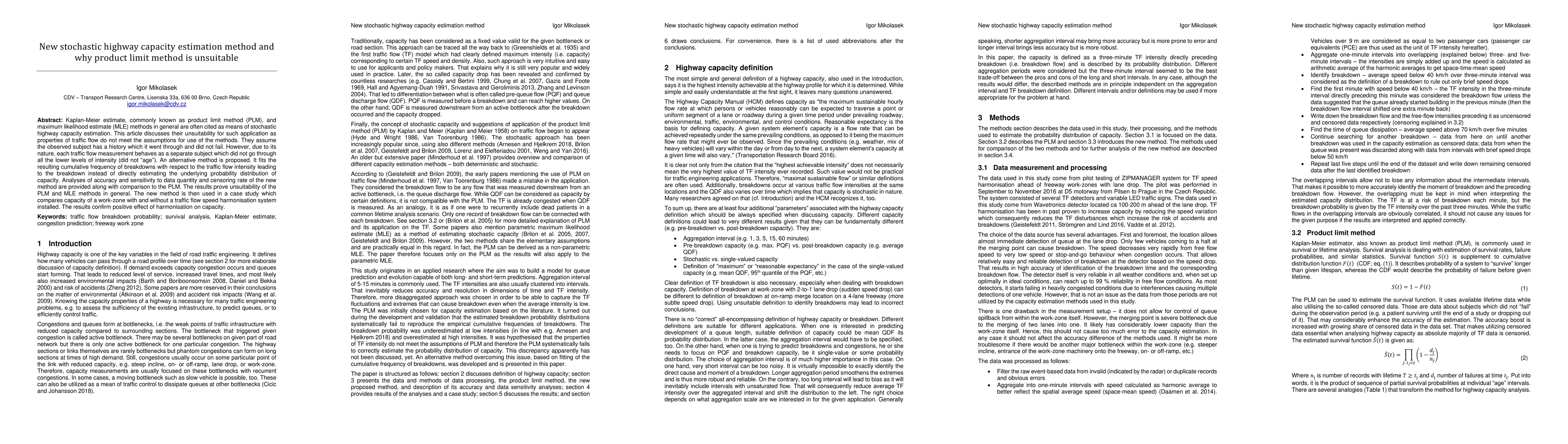 Kaplan-Meier estimate, commonly known as product limit method (PLM), and maximum likelihood estimate (MLE) methods in general are often cited as means of stochastic highway capacity estimation. This article discusses their unsuitability for such application as properties of traffic flow do not meet the assumptions for use of the methods. They assume the observed subject has a history which it went through and did not fail. However, due to its nature, each traffic flow measurement behaves as a separate subject which did not go through all the lower levels of intensity (did not "age"). An alternative method is proposed. It fits the resulting cumulative frequency of breakdowns with respect to the traffic flow intensity leading to the breakdown instead of directly estimating the underlying probability distribution of capacity. Analyses of accuracy and sensitivity to data quantity and censoring rate of the new method are provided along with comparison to the PLM. The results prove unsuitability of the PLM and MLE methods in general. The new method is then used in a case study which compares capacity of a work-zone with and without a traffic flow speed harmonisation system installed. The results confirm positive effect of harmonisation on capacity.