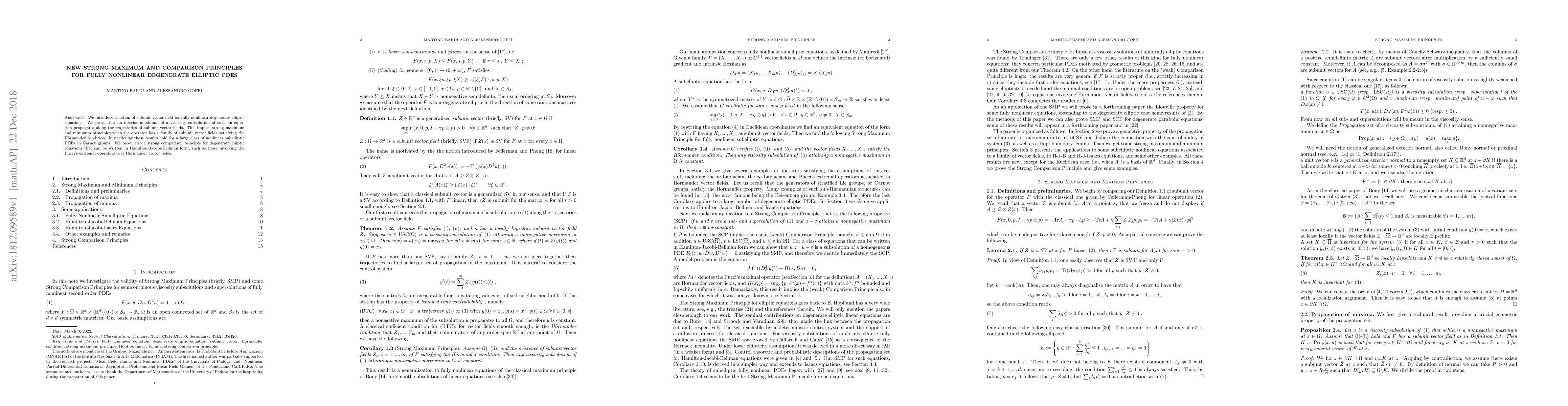 This paper introduces a subunit vector field concept for fully nonlinear degenerate elliptic PDEs, proving strong maximum and minimum principles under the H\"ormander condition. It also establishes a strong comparison principle for equations in Hamilton-Jacobi-Bellman form, applicable to a broad class of nonlinear subelliptic PDEs.
