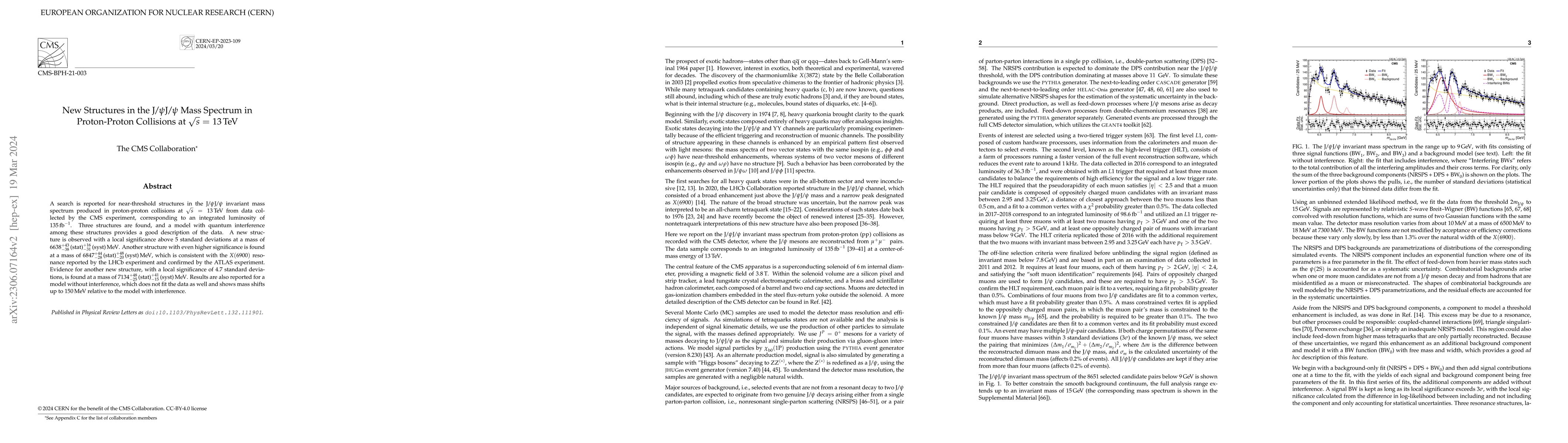 The CMS experiment observed three new structures in the J/$\psi$ invariant mass spectrum from proton-proton collisions at 13 TeV, with one new structure at 6638 MeV, another at 6847 MeV matching the X(6900) resonance, and a third at 7134 MeV. Quantum interference among these structures provides a better fit to the data than a model without interference.