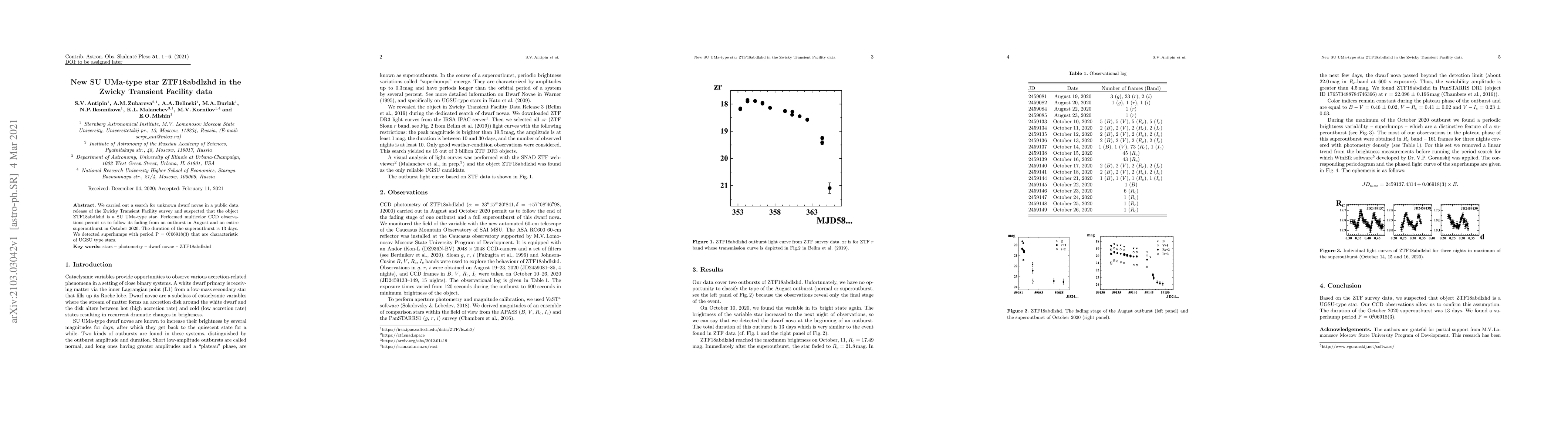We carried out a search for unknown dwarf novae in a public data release of the Zwicky Transient Facility survey and suspected that the object ZTF18abdlzhd is a SU UMa-type star. Performed multicolor CCD observations permit us to follow its fading from an outburst in August and an entire superoutburst in October 2020. The duration of the superoutburst is 13 days. We detected superhumps with period P = 0.06918(3) d that are characteristic of UGSU type stars.