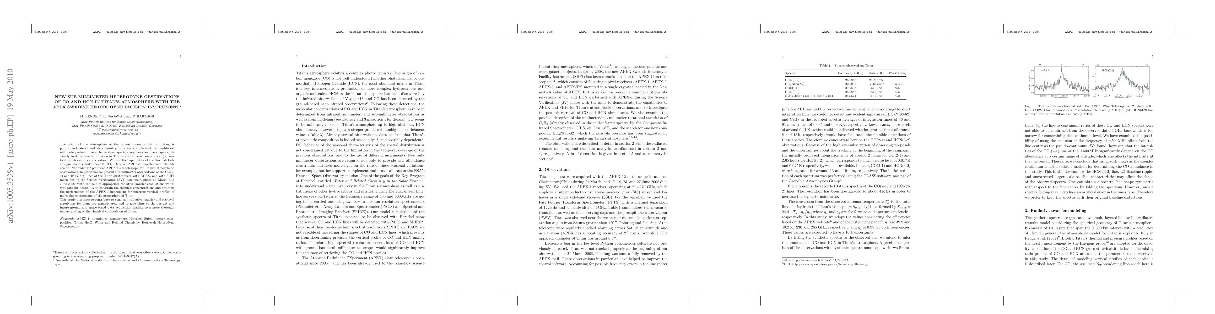 This study uses the APEX telescope and SHFI to observe CO and HCN in Titan's atmosphere, aiming to better understand its complex chemistry and vertical profiles. The results from sub-millimeter heterodyne spectroscopy provide insights into Titan's atmospheric composition and help optimize the instrument for future observations.