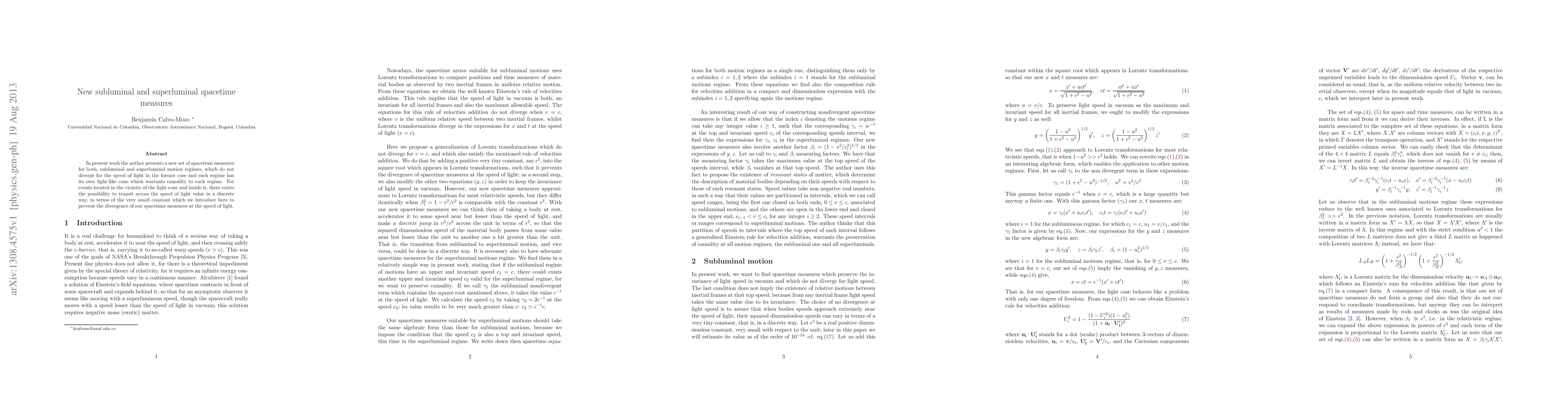 In present work the author presents a new set of spacetime measures for both, subluminal and superluminal motion regimes, which do not diverge for the speed of light in the former case and each regime has its own light-like cone which warrants causality to each regime. For events located in the vicinity of the light cone and inside it, there exists the possibility to transit across the speed of light value in a discrete way, in terms of the very small constant which we introduce here to prevent the divergence of our spacetime measures at the speed of light.