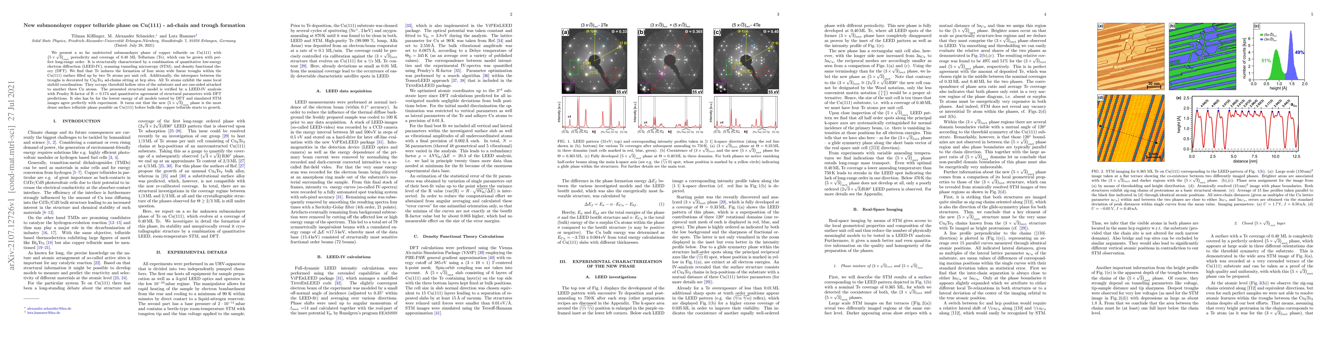 This research identifies a new submonolayer copper telluride phase on Cu(111) characterized by a $\left(5 \times \sqrt{3}\right)_{\text{rect}}$ structure, with Te atoms forming linear troughs and Cu$_2$Te$_2$ ad-chains. The structure is confirmed via LEED-IV, STM, and DFT, revealing the densest telluride arrangement before bulk growth.