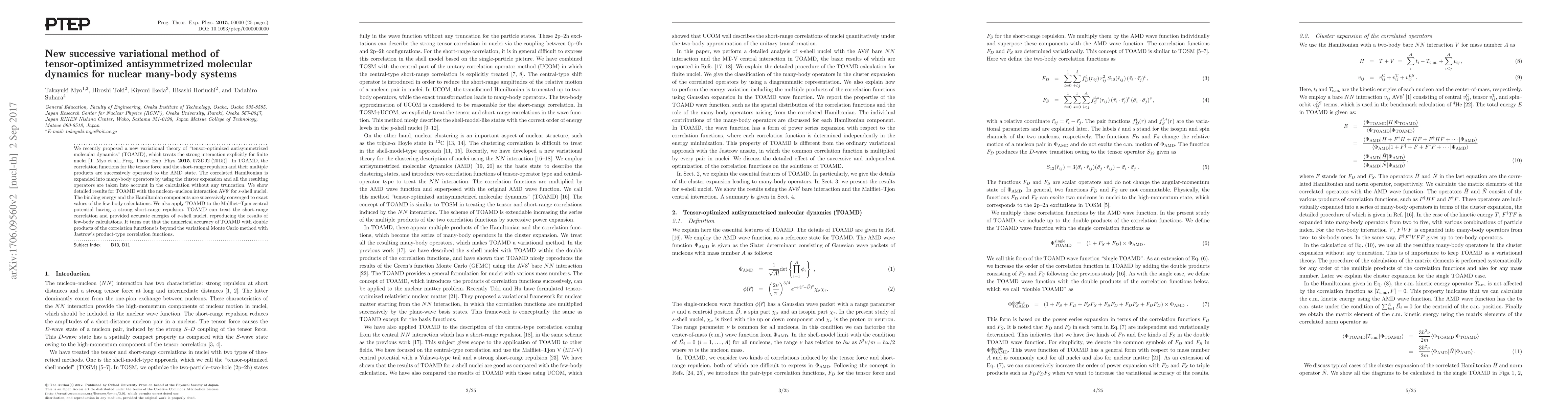This paper introduces a new successive variational method called tensor-optimized antisymmetrized molecular dynamics (TOAMD) for nuclear many-body systems, achieving high accuracy in binding energies and Hamiltonian components for $s$-shell nuclei, surpassing variational Monte Carlo methods. TOAMD effectively treats short-range correlations and reproduces results from few-body calculations.
