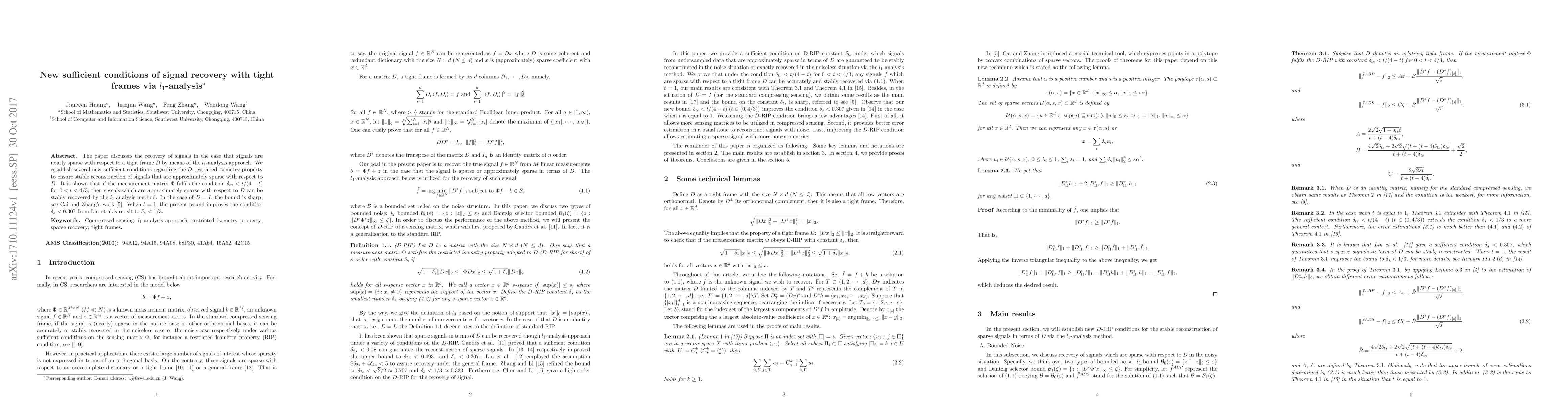 Researchers establish new conditions for stable signal recovery using $l_1$-analysis with tight frames, improving bounds on the measurement matrix's property when signals are nearly sparse.