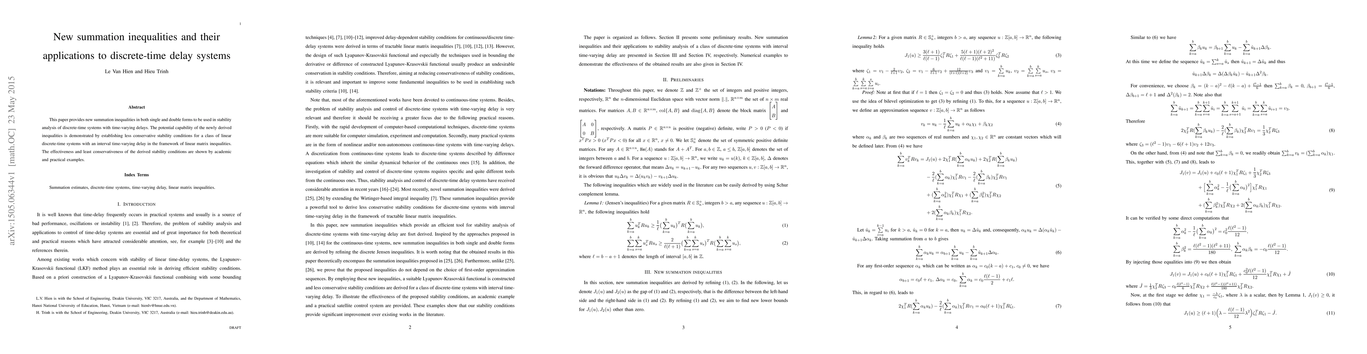 This paper introduces new summation inequalities for stability analysis of discrete-time systems with time-varying delays, demonstrating their effectiveness through less conservative stability conditions and supported by both academic and practical examples.