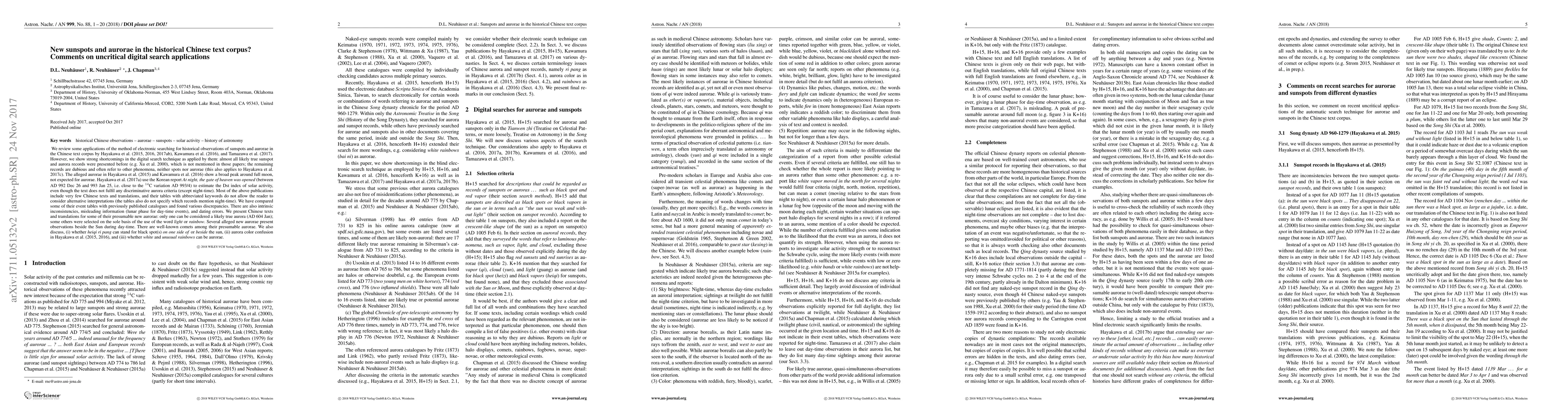 We review some applications of the method of electronic searching for historical observations of sunspots and aurorae in the Chinese text corpus by Hayakawa et al. etc. However, we show strong shortcomings in the digital search technique as applied by them: almost all likely true sunspot and aurora records were presented before (e.g. Xu et al. 2000), which is not mentioned in those papers; the remaining records are dubious and often refer to other phenomena, neither spots nor aurorae (this also applies to Hayakawa et al. 2017c). Most of the above publications include very few Chinese texts and translations, and their tables with abbreviated keywords do not allow the reader to consider alternative interpretations (the tables also do not specify which records mention night-time). We have compared some of their event tables with previously published catalogs and found various discrepancies. There are also intrinsic inconsistencies, misleading information (lunar phase for day-time events), and dating errors. We present Chinese texts and translations for some of their presumable new aurorae: only one can be considered a likely true aurora (AD 604 Jan); some others were selected on the sole basis of the use of the word "light" or "rainbow". Several alleged new aurorae present observations beside the Sun during day-time. There are well-known comets among their presumable aurorae. We also discuss, (i) whether "heiqi ri pang" can stand for black spot(s) "on one side of" or "beside" the sun, (ii) aurora color confusion in Hayakawa et al. (2015, 2016), and (iii) whether "white" and "unusual rainbows" can be aurorae.
