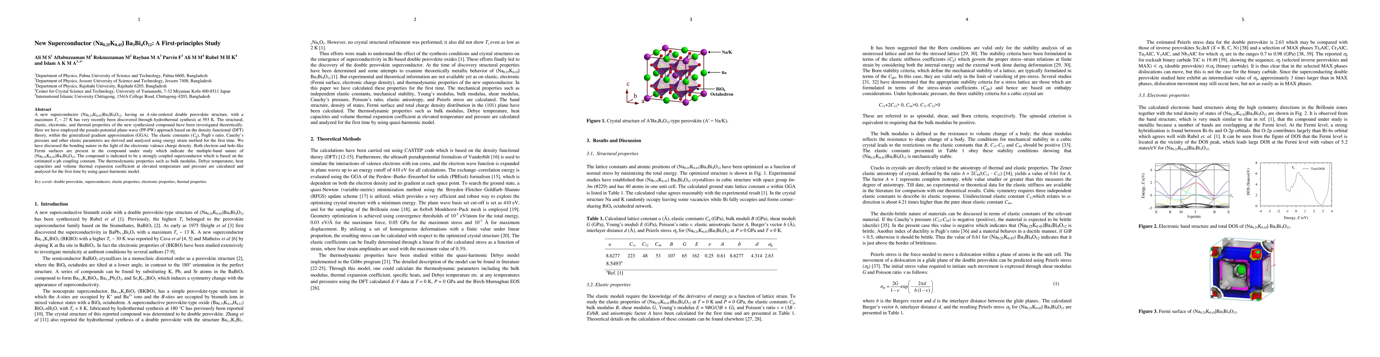 This study investigates the new superconductor (Na0.25K0.45)Ba3Bi4O12 using density functional theory, revealing its elastic, electronic, and thermal properties. The compound exhibits a multiple-band nature with both electron and hole-like Fermi surfaces, suggesting strong electron-phonon coupling and high-temperature superconductivity.