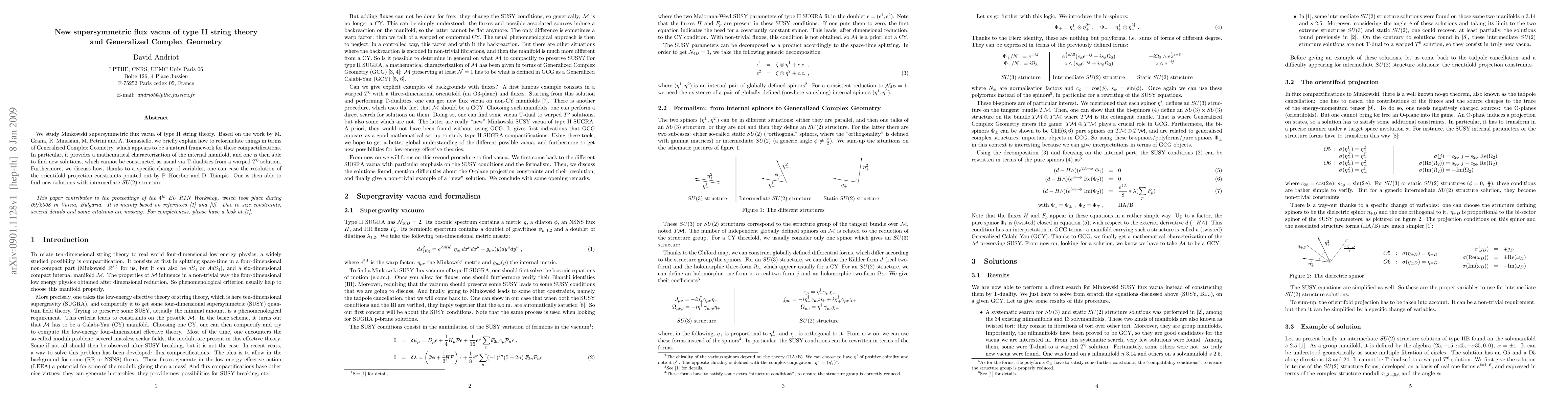 This paper explores new supersymmetric flux vacua in type II string theory using Generalized Complex Geometry, providing a novel framework for compactifications that yields solutions not obtainable via traditional T-dualities. It also simplifies the resolution of orientifold constraints, leading to new solutions with intermediate SU(2) structure.
