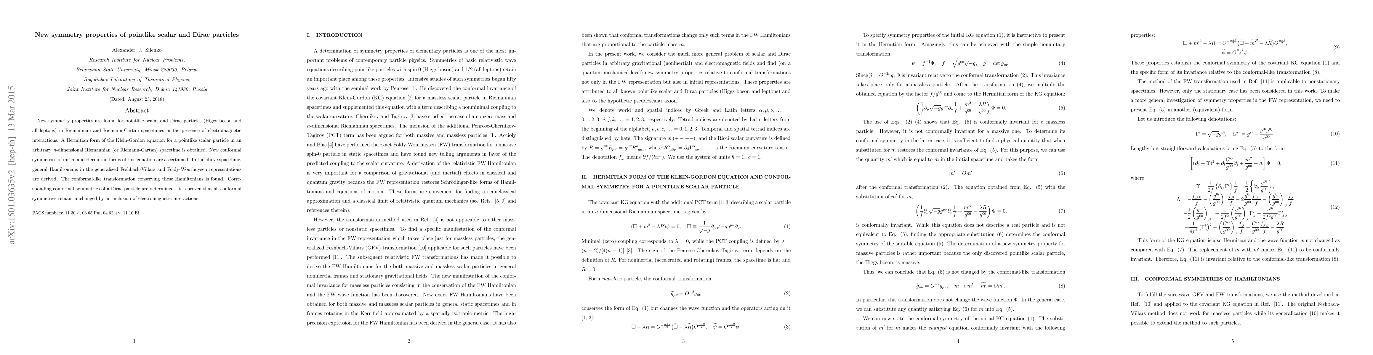 New symmetry properties are found for pointlike scalar and Dirac particles (Higgs boson and all leptons) in Riemannian and Riemann-Cartan spacetimes in the presence of electromagnetic interactions. A Hermitian form of the Klein-Gordon equation for a pointlike scalar particle in an arbitrary n-dimensional Riemannian (or Riemann-Cartan) spacetime is obtained. New conformal symmetries of initial and Hermitian forms of this equation are ascertained. In the above spacetime, general Hamiltonians in the generalized Feshbach-Villars and Foldy-Wouthuysen representations are derived. The conformal-like transformation conserving these Hamiltonians is found. Corresponding conformal symmetries of a Dirac particle are determined. It is proven that all conformal symmetries remain unchanged by an inclusion of electromagnetic interactions.