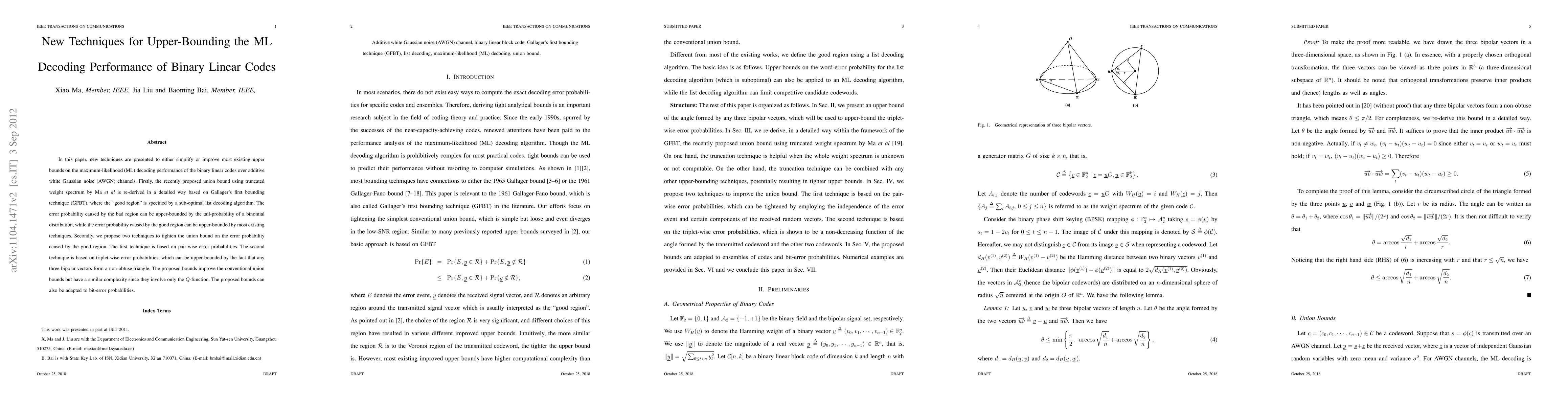 This paper introduces new methods to enhance or simplify existing upper bounds on the maximum-likelihood decoding performance of binary linear codes over AWGN channels. It re-derives the union bound using Gallager's first bounding technique and proposes two techniques to tighten the bound, based on pair-wise and triplet-wise error probabilities.