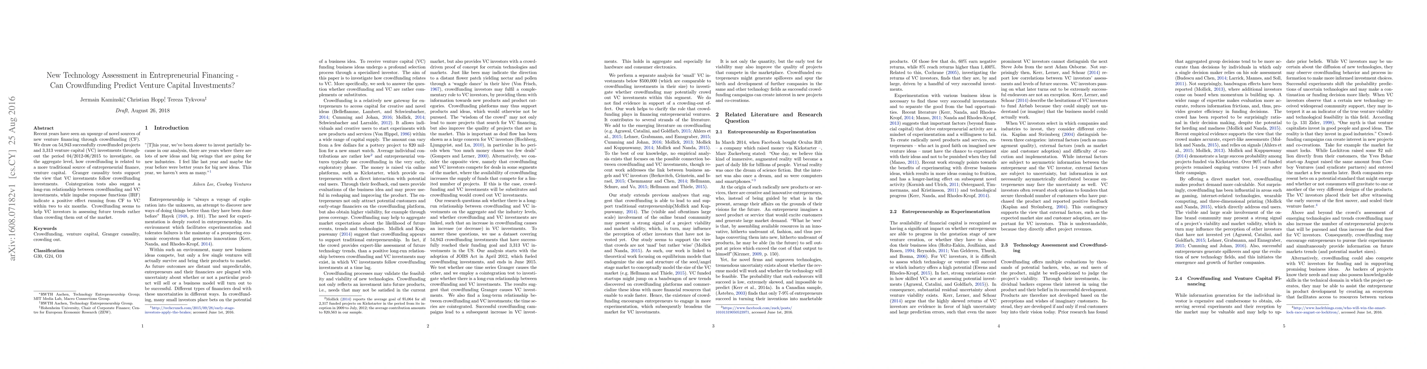This paper explores the relationship between crowdfunding and venture capital investments using data from 2012 to 2015. Results from Granger causality and cointegration tests indicate that venture capital investments tend to follow crowdfunding investments, suggesting crowdfunding aids VCs in trend assessment rather than replacing them.
